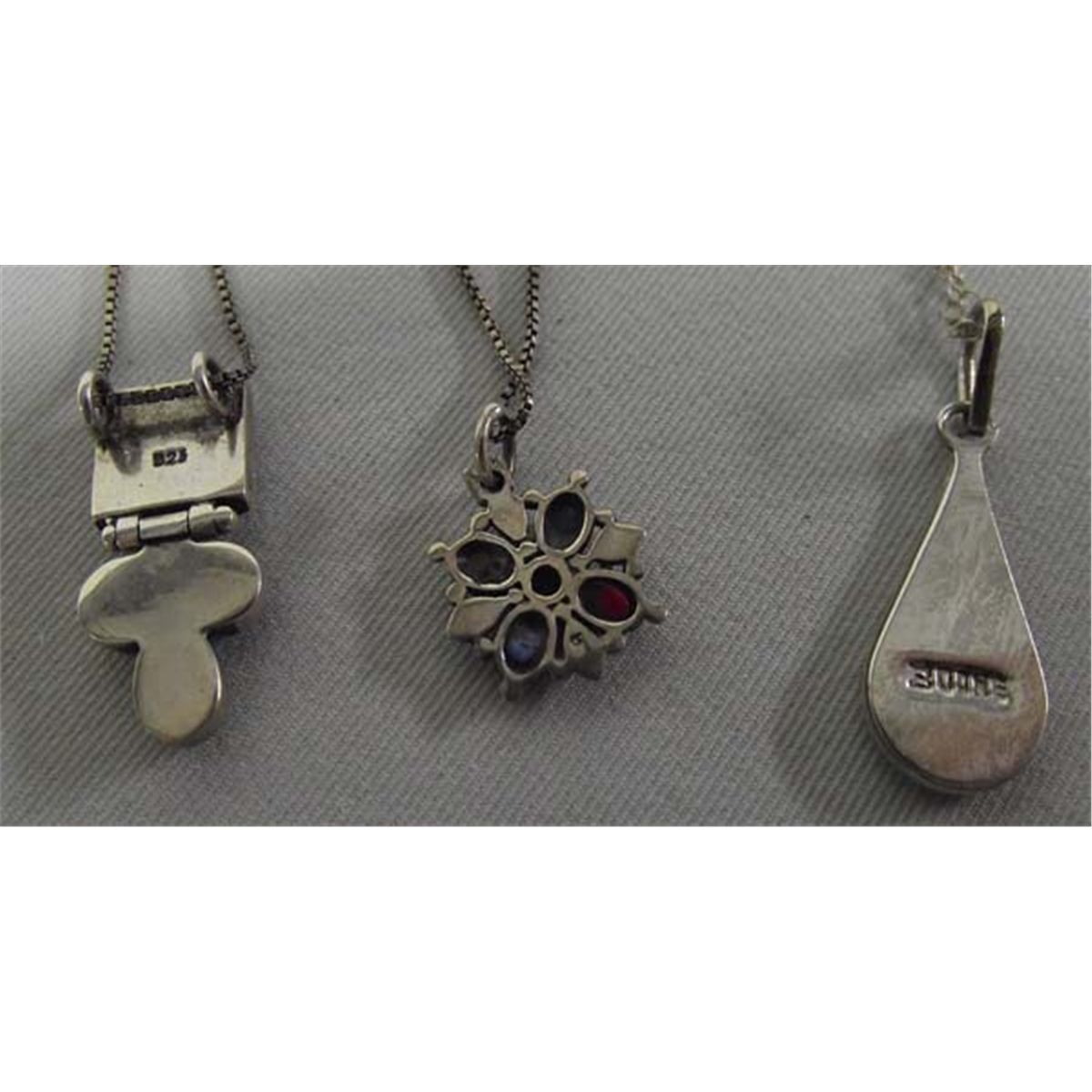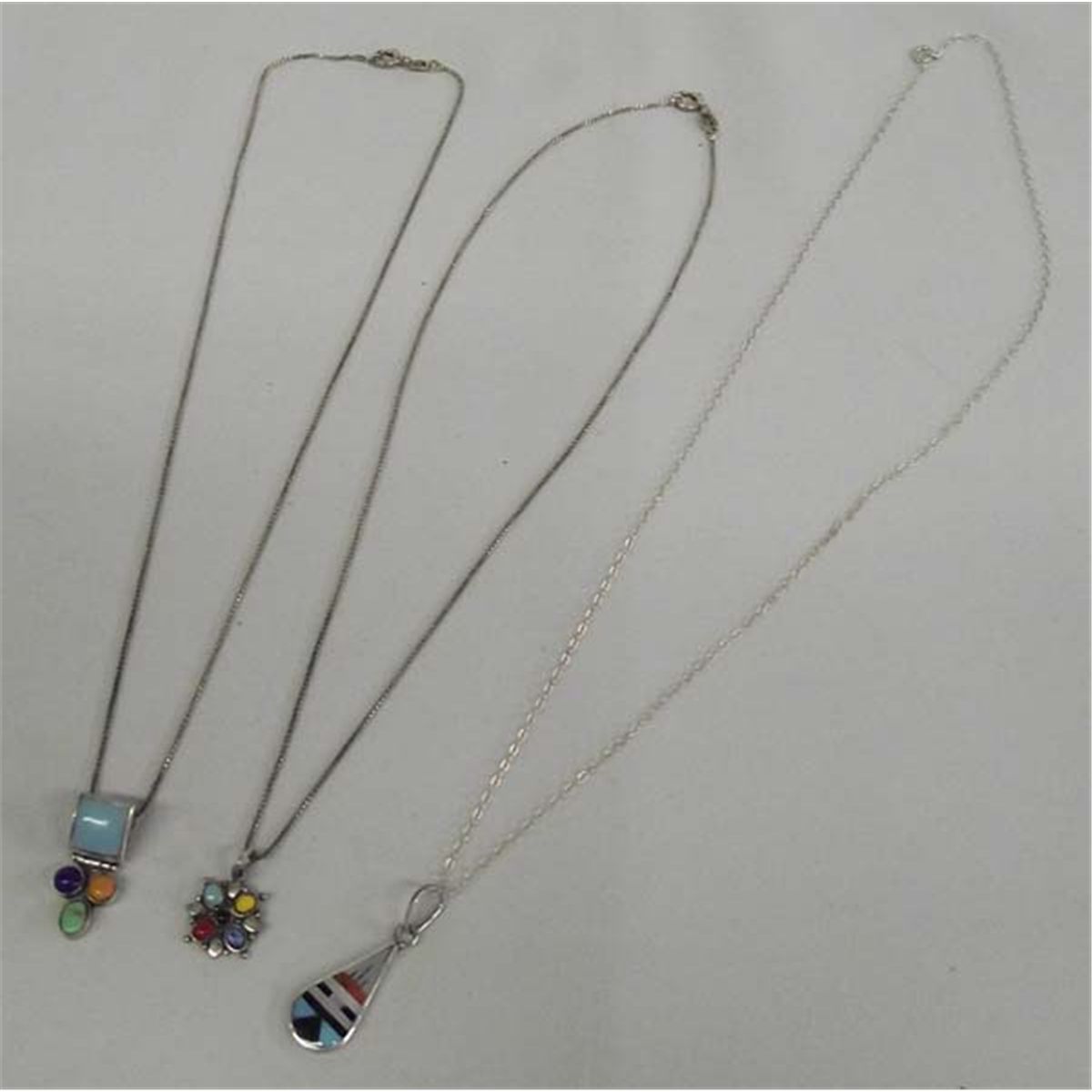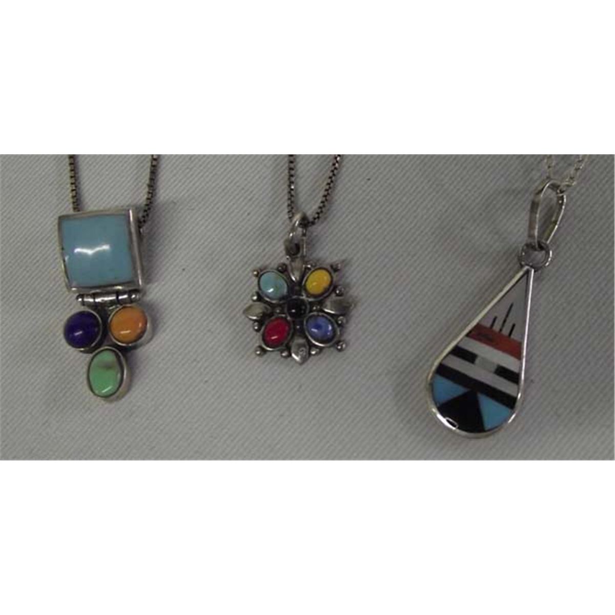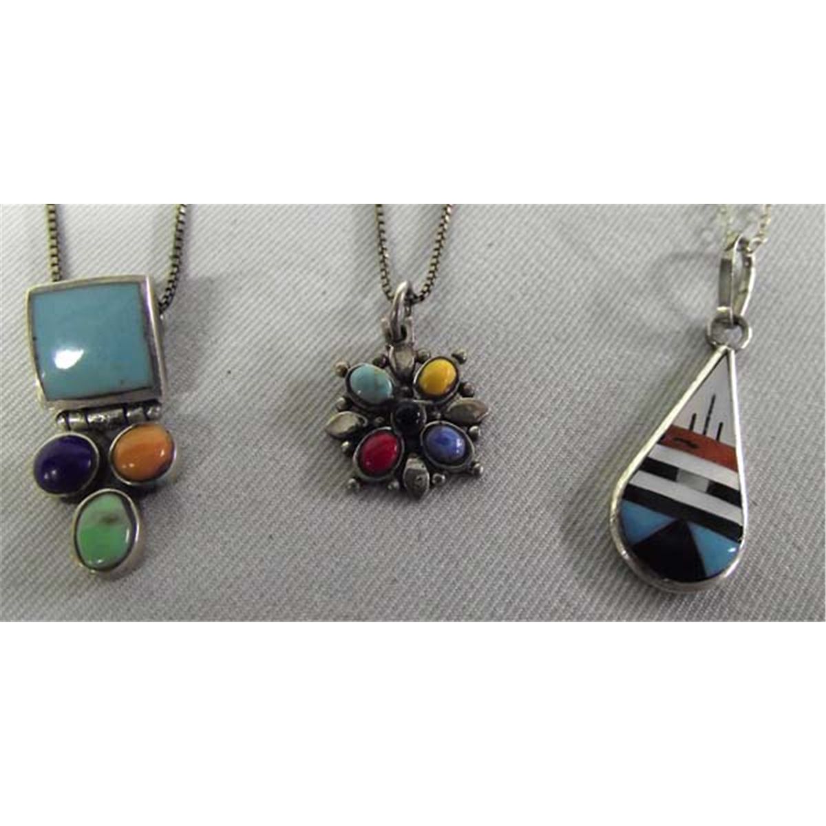 Three Indian Multi-Stone Pendant Necklaces. Longest necklace, including pendant measures 11 1/2''. Stones include coral, turquoise, onyx, mother of pearl and lapis. Hinged pendant is marked ''925'', tear-drop Zuni channel inlay pendant stamped ''Sterling''. Buyers Pay Actual Shipping and Handling Charges(see terms and conditions for more information).