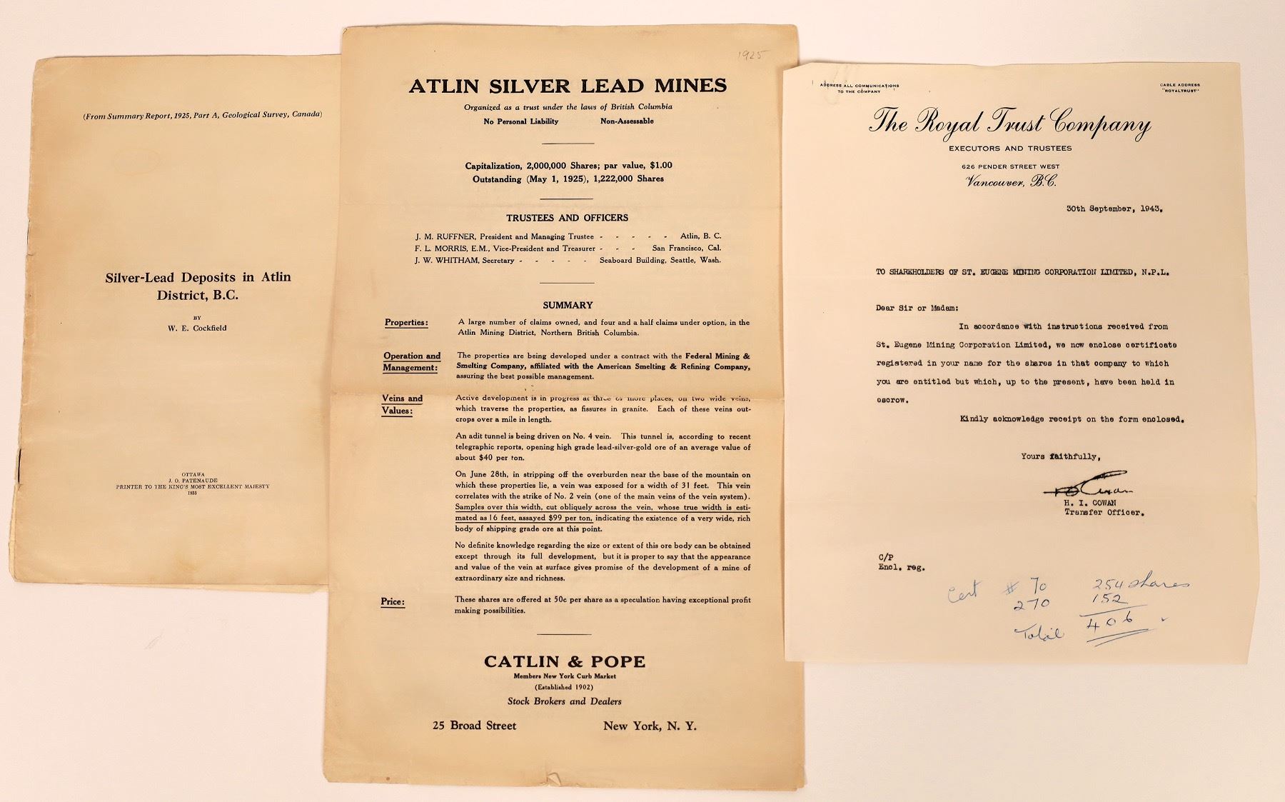 1) Atlin Silver Lead Mines, report by Catlin & Pope of New York. 1925. Four extra large pages; 2) 1925 summary report of the Silver-Lead deposits in Atlin. 10 pages. Two small maps; 3) St. Eugene letter on the arrival of a stock certificate. Dateline Vancouver, 1943.
