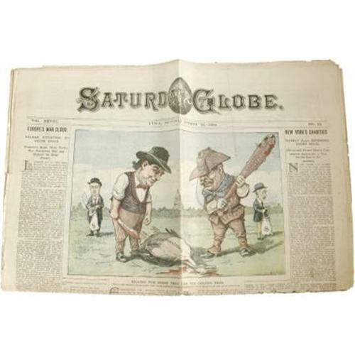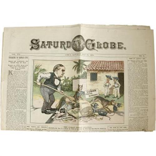 <B>Three Issues of the <I>Saturday Globe,</B></I></B></I> May 26, 1900; October 10, 1908; and November 7, 1908, 16 x 22. The <I>Saturday Globe</B></I> was the first United States newspaper that could claim to be a truly national newspaper. It pioneered methods in news gathering, printing and building (and holding) a large circulation. All three issues folded with some tearing along the folds. Very nice color on the front pages with interesting content inside each issue. <BR><BR><b>Shipping:</b> Flat Material, Small (<a target="_blank" href="http://www.heritageauctions.com/common/shipping.php">view shipping information</a>)