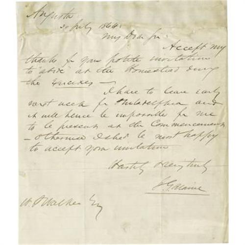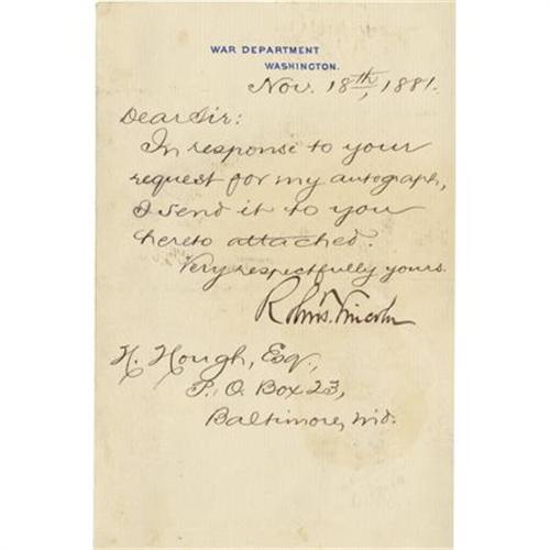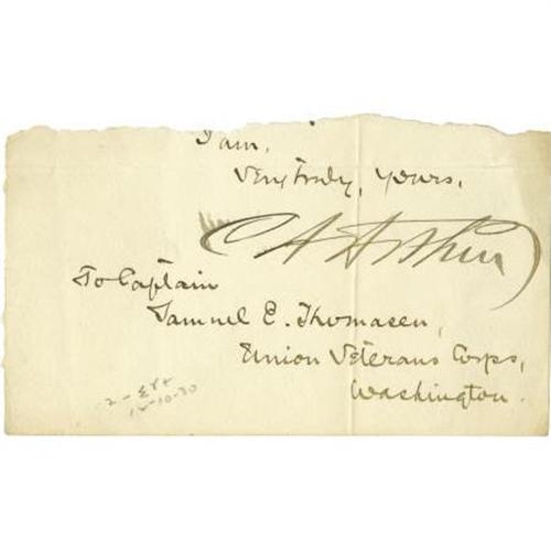 <B>Three Items Pertaining To Chester A. Arthur Presidency,</B></I> as follows:<BR><B>Chester A. Arthur Clipped Signature,</B></I> 5” x 3”, from a letter, n.d., n.p.<BR><B>Secretary of War Robert Todd Lincoln Letter Signed,</B></I> one page on War Department letterhead, Washington, D.C., November 18, 1881, to H. Hough, Baltimore, Maryland. President Lincoln's son here responds to an autograph seeker.<BR><B>Secretary of State James G. Blaine Autograph Letter Signed,</B></I> one page, 7.25” x 8.5”, one page, Augusta, Maine, to W. J. Walker. The perennial politician here declines a Civil War era invitation. All items in very good to fine condition. <I>From the collection of Henry E. Luhrs.</B></I><BR><BR><b>Shipping:</b> Flat Material, Small (<a target="_blank" href="http://www.heritageauctions.com/common/shipping.php">view shipping information</a>)