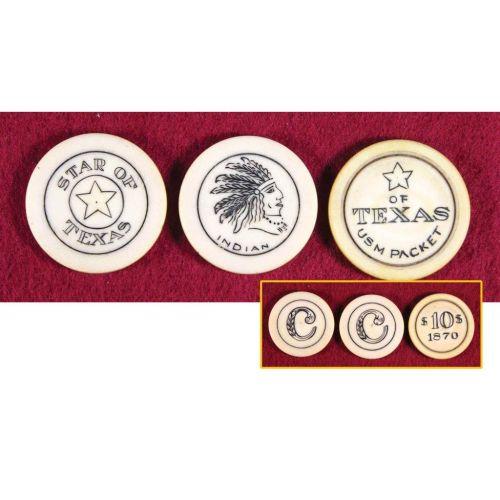 Three Ivory Poker Chips including the Star of Texas, Indian and Star of Texas USM Packet 10 Dollar 1870. No chips or cracks, excellent condition.