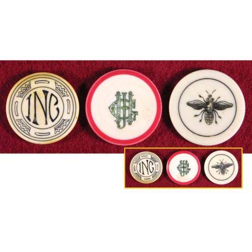 Three Ivory Poker Chips including ING, JHG and a fly. No chips or cracks, excellent condition.