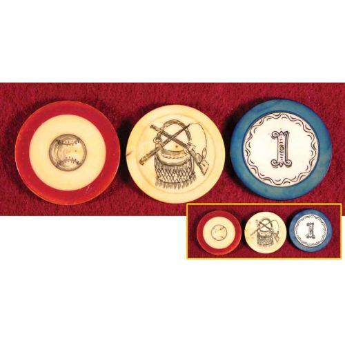 Three Ivory Poker Chips depicting a baseball, fishing and hunting gear and One Dollar. Small crack on fishing chip otherwise excellent condition.