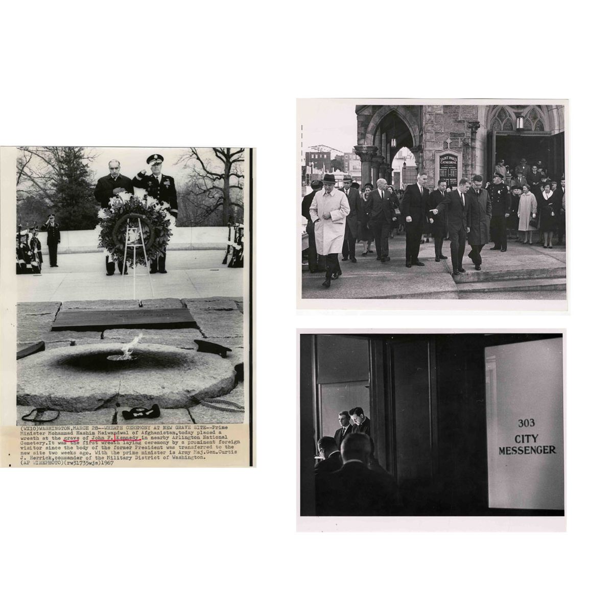Three original press photos from President John F. Kennedy's memorial service and his gravesite. Caption to one photo reads, ''...Wreath ceremony at new grave site...Prime Minister...of Afghanistan, today placed a wreath at the grave of John F. Kennedy...it was the first wreath laying ceremony by a prominent foreign visitor...'' Two additional photos dated 25 and 26 November 1963 are from the President's memorial service. From the Robert L. White JFK collection. Near fine condition.