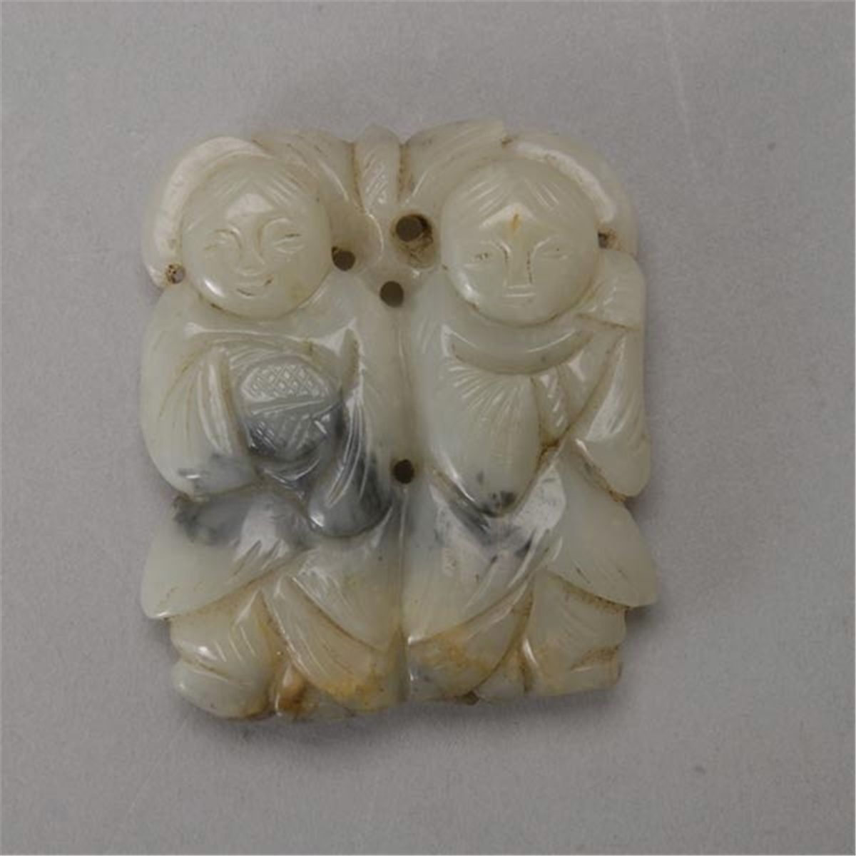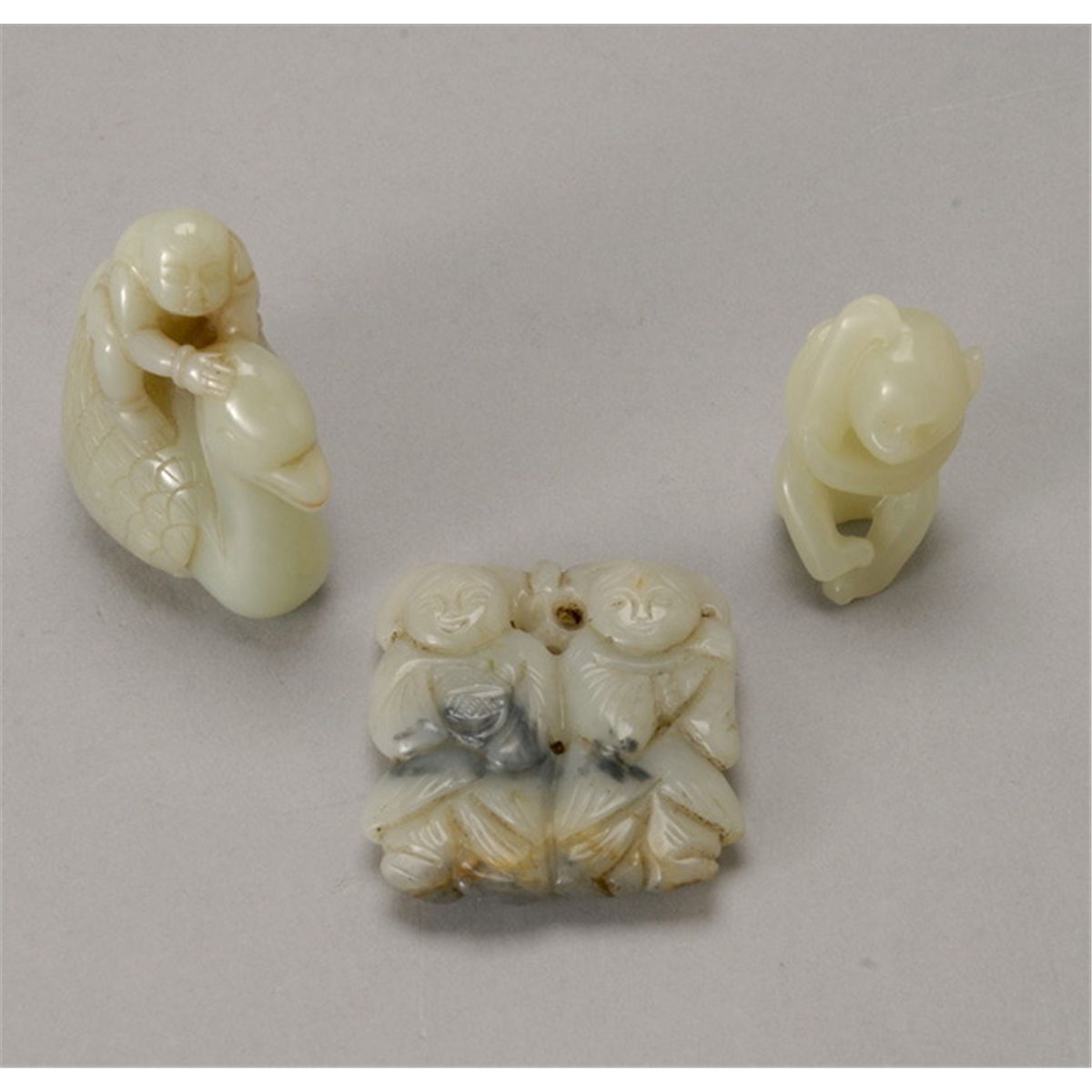 Three Jade Carvings, The first of the HeHe twins; the second of a boy riding duck; the third of a monkey scratching its head and with legs crossed, each stone of pale celadon color. Tallest: 2 5/8 inches (6.7 cm) [Surface soiling. This condition report states major condition issues only.]