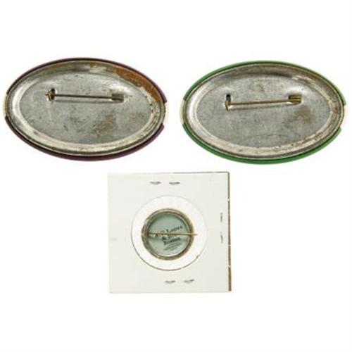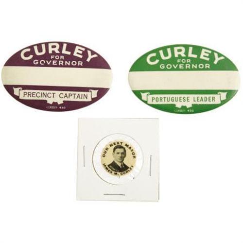 <B>Three James M. Curley Buttons</B></I> Presented here is a nice grouping of Curley buttons. These locals represent the politician from Massachusetts who endeared himself to Bostonians as mayor and lost the confidence of his constituents after his Governorship was rocked by scandal. The group consists of two oval 3" buttons that represent his campaign for governor in 1934, and 7/8" picture pin used during his campaign for mayor of Boston. All three are in excellent condition.<BR><BR><b>Shipping:</b> Miscellaneous Collectibles, Smal (<a target="_blank" href="http://www.heritageauctions.com/common/shipping.php">view shipping information</a>)