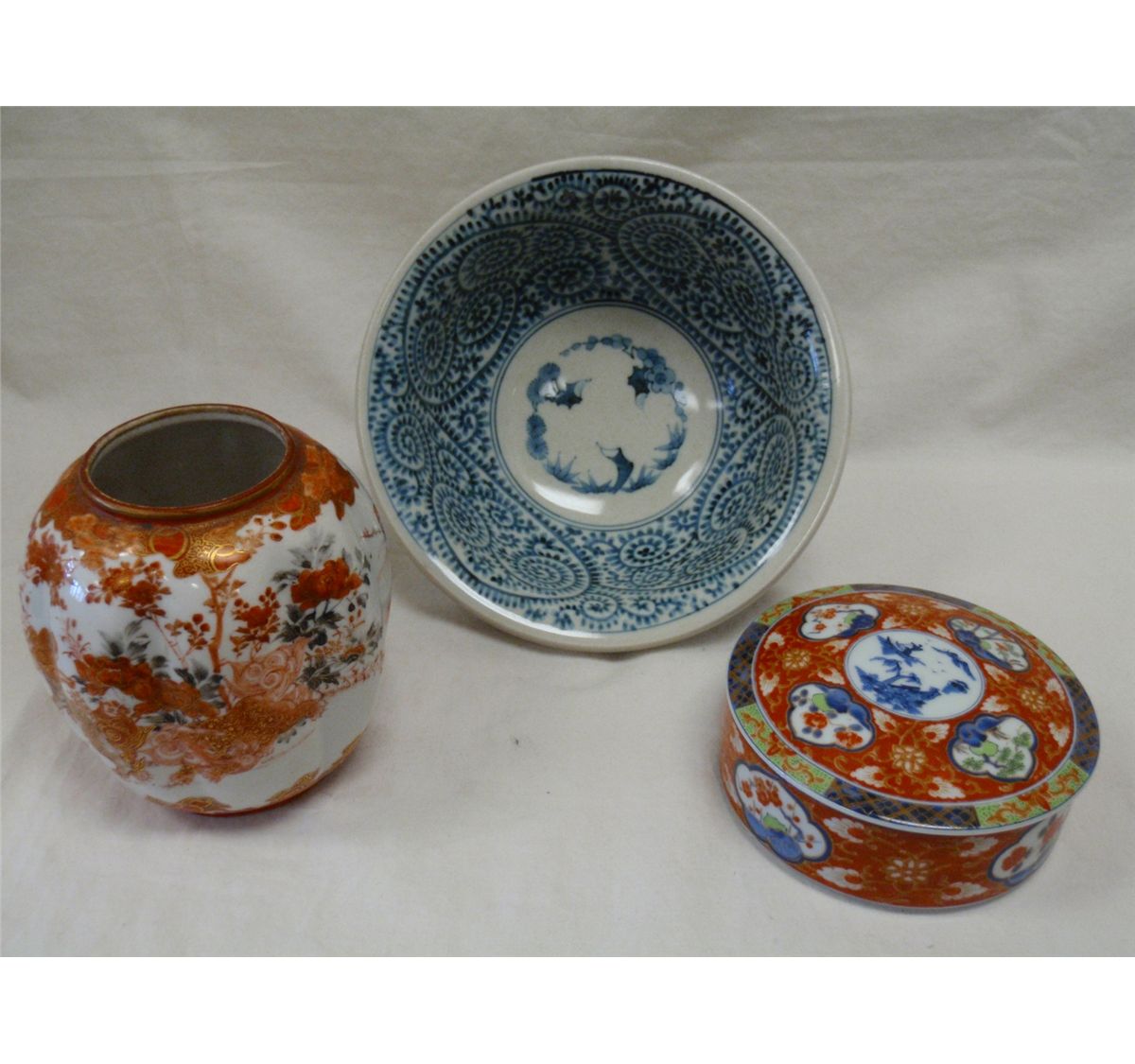 Modern Imari box; modern Japanese, blue and white bowl, Kutani vase, 1920's. Measurements: Box = 4 3/4" Diameter x 3" Tall. -- Vase = 3 1/2" Diameter x 5" Tall. -- Bowl = 7 1/2" Diameter x 3 1/2" Tall. - Shipping charge are for the United States. The shipping on this lot is $20.00. Outside the United States there will be additional shipping fees.
