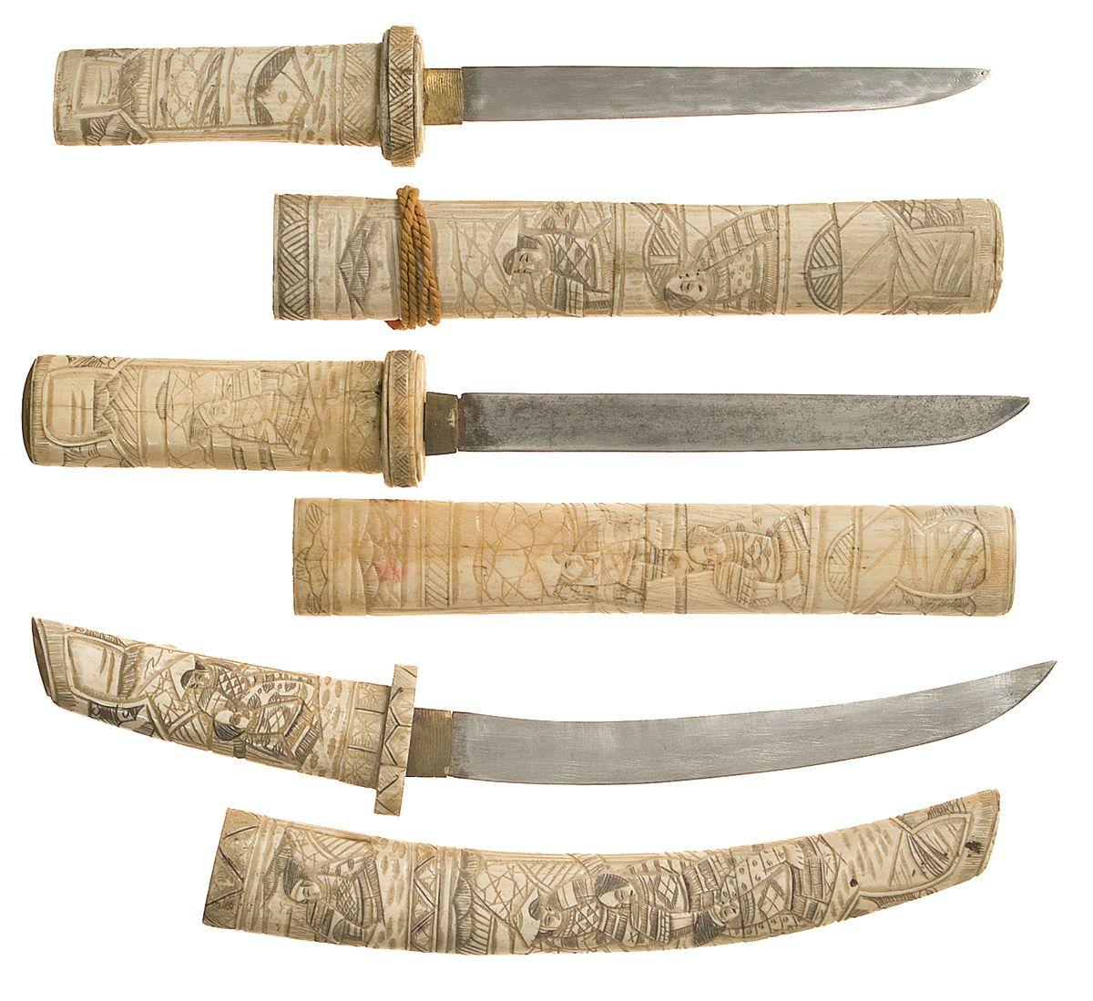 All three have unmarked blades, brass collars and carved bone fittings with warrior scenes. 1) 6 1/4" blade, with filled-in hilt and a short brown cord on the sheath. 2) 6 1/2" blade, with the kurigata absent from the sheath. 3) 7" curved blade, with uncapped bone ends and a pair of holes in the rear of the sheath. All are very good or better, with some spotting, polishing marks and cracks.
