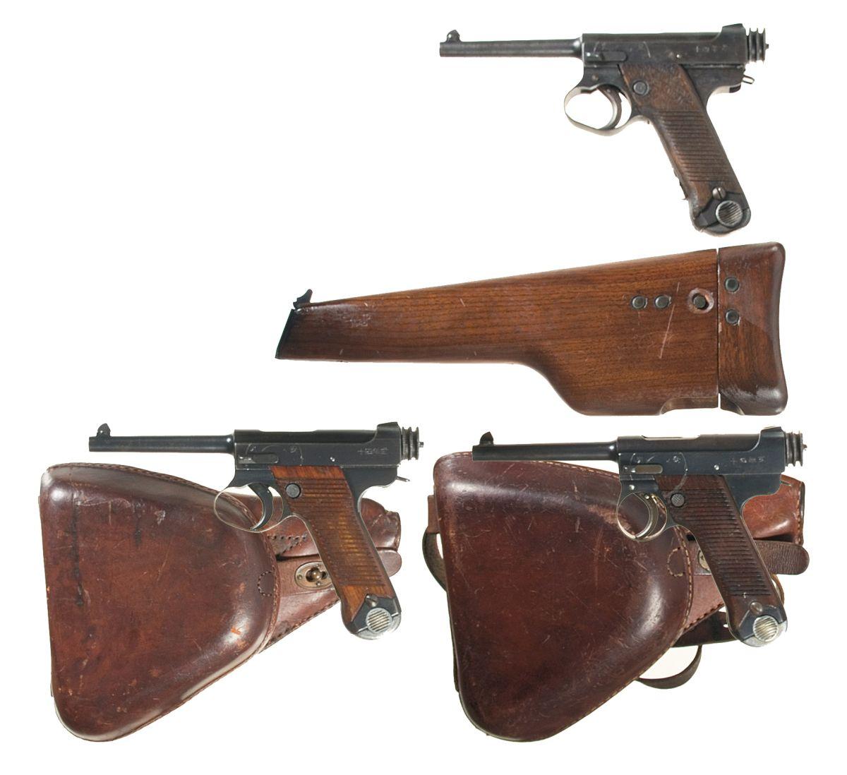 A) Right frame marked "18.10" manufacture date with standard markings and features. Grips have war trophy history inscriptions with left grip "Taken/from killed/Jap at encounter/at Paso Tablas/Cavite/2-5-45" and right grip "by/Major/L.L. Alfonso/II Corps/USAFIP". Complete with original holster stock for Inglis Hi Power pistol marked "Made in Canada" on back with strap.