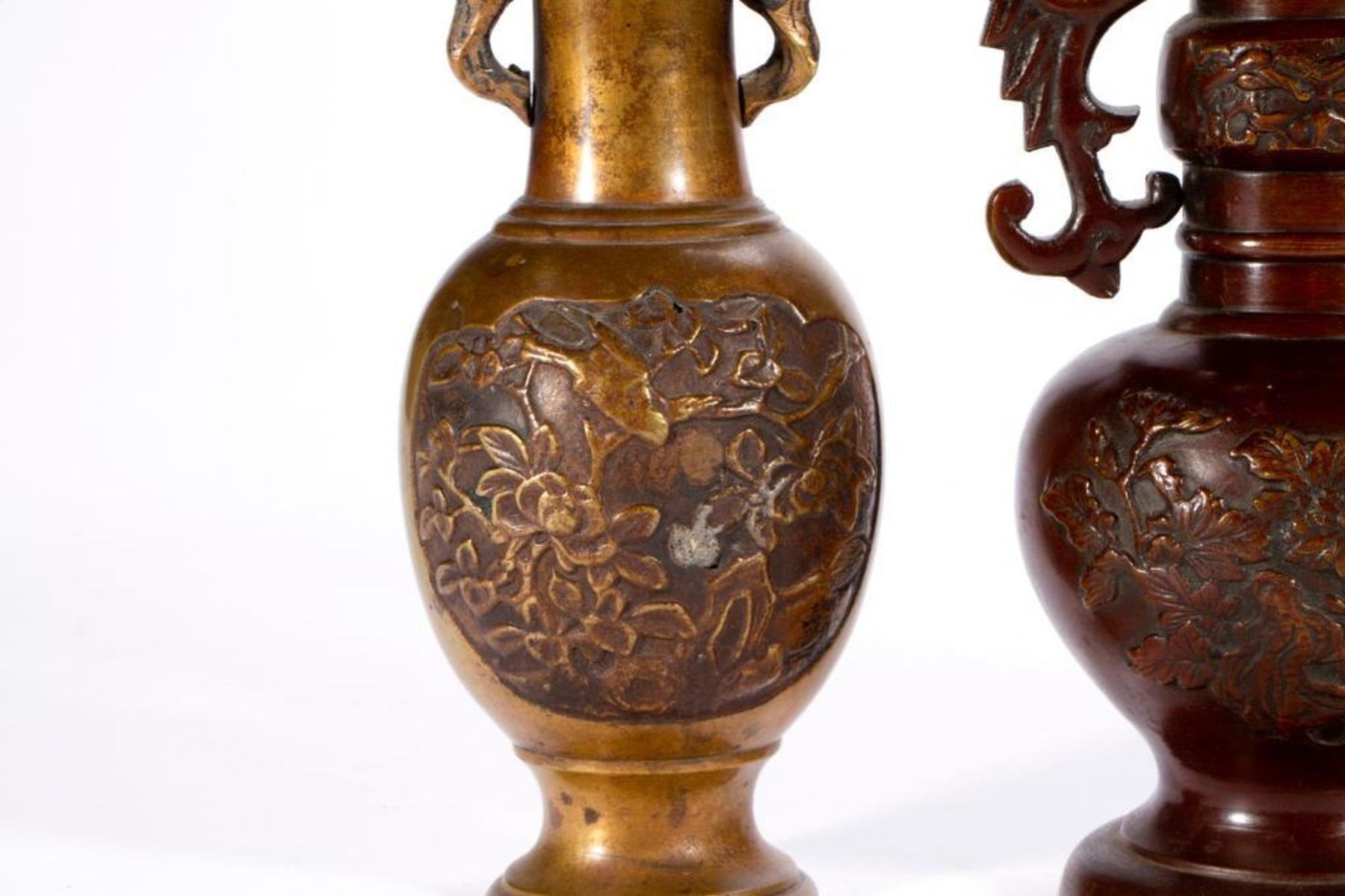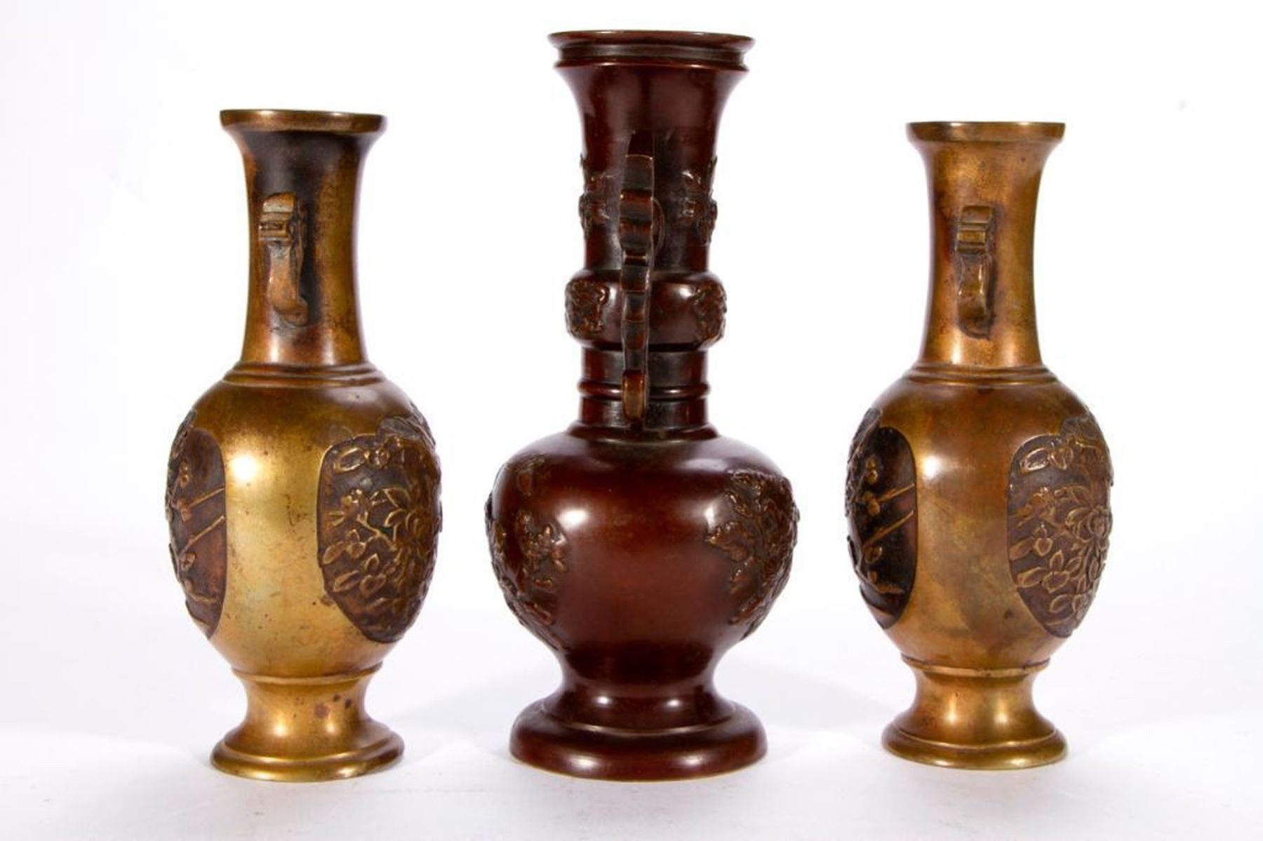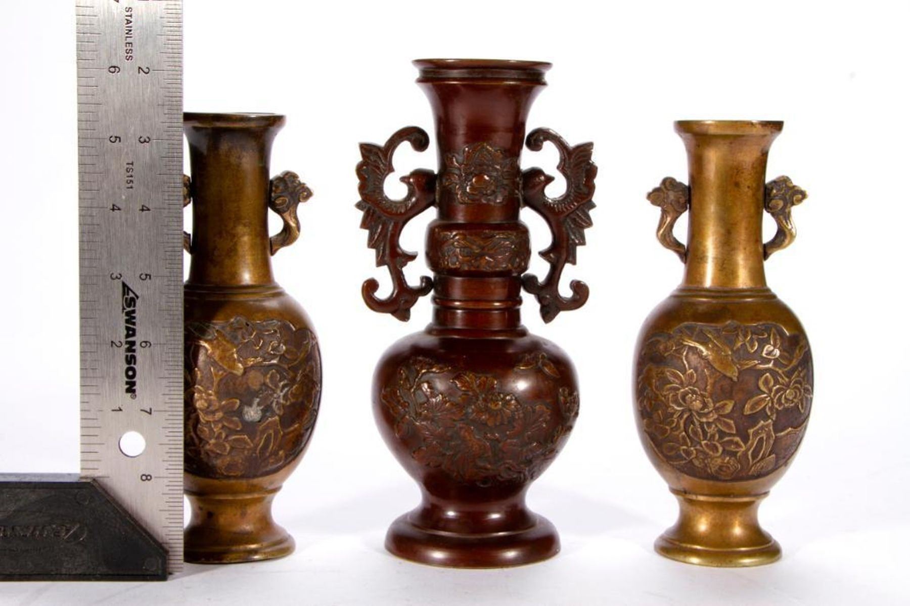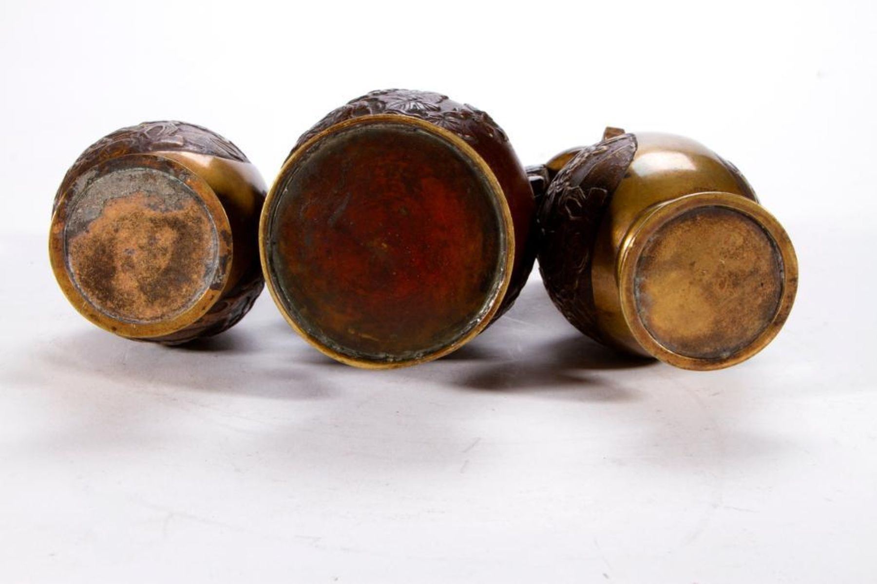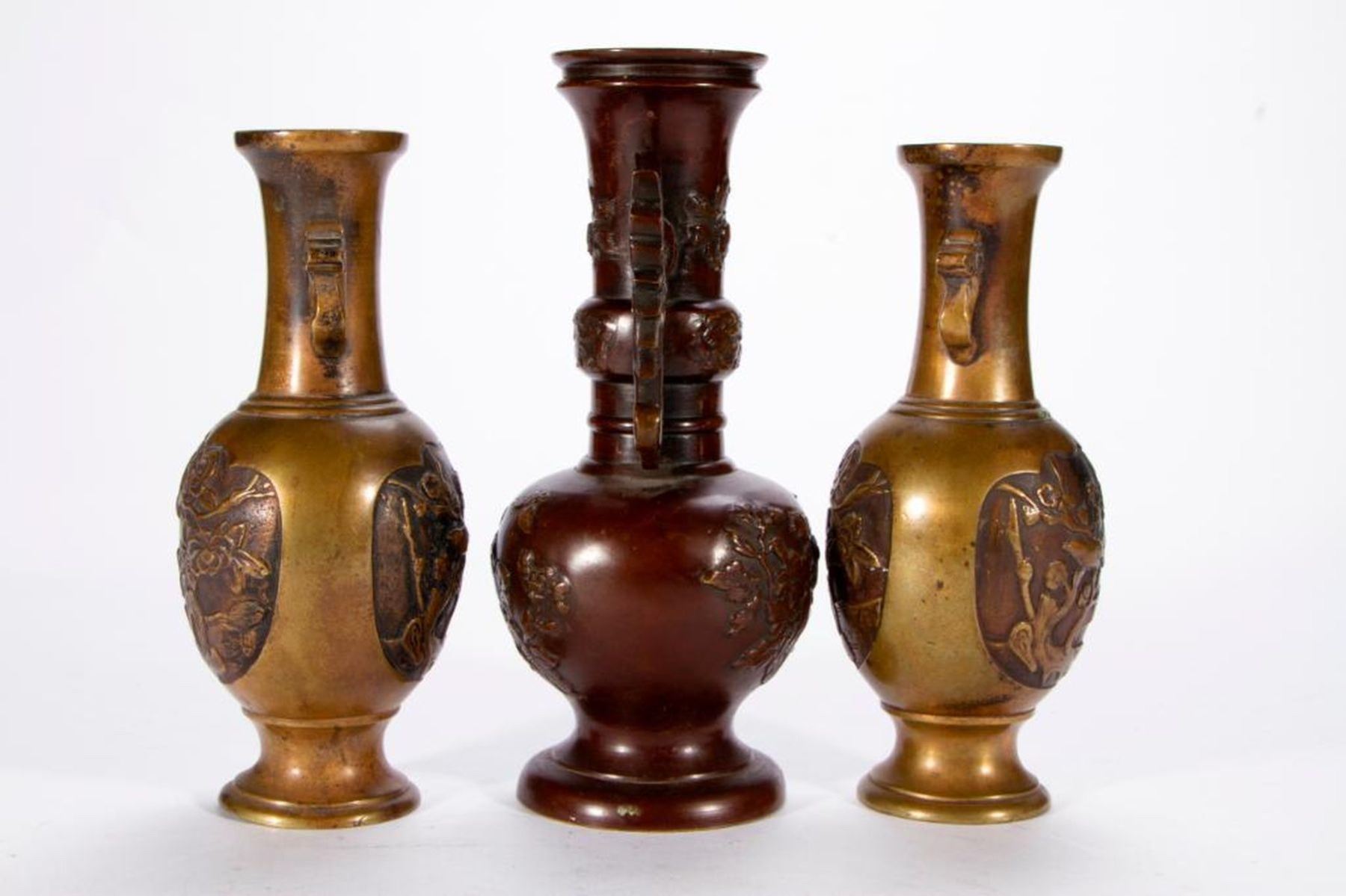 A pair of Japanese bronze vases with bird friezes and a third with chrysanthemums and butterflies. Tallest H - 8" Dia. - 3 1/2". Condition: Good.