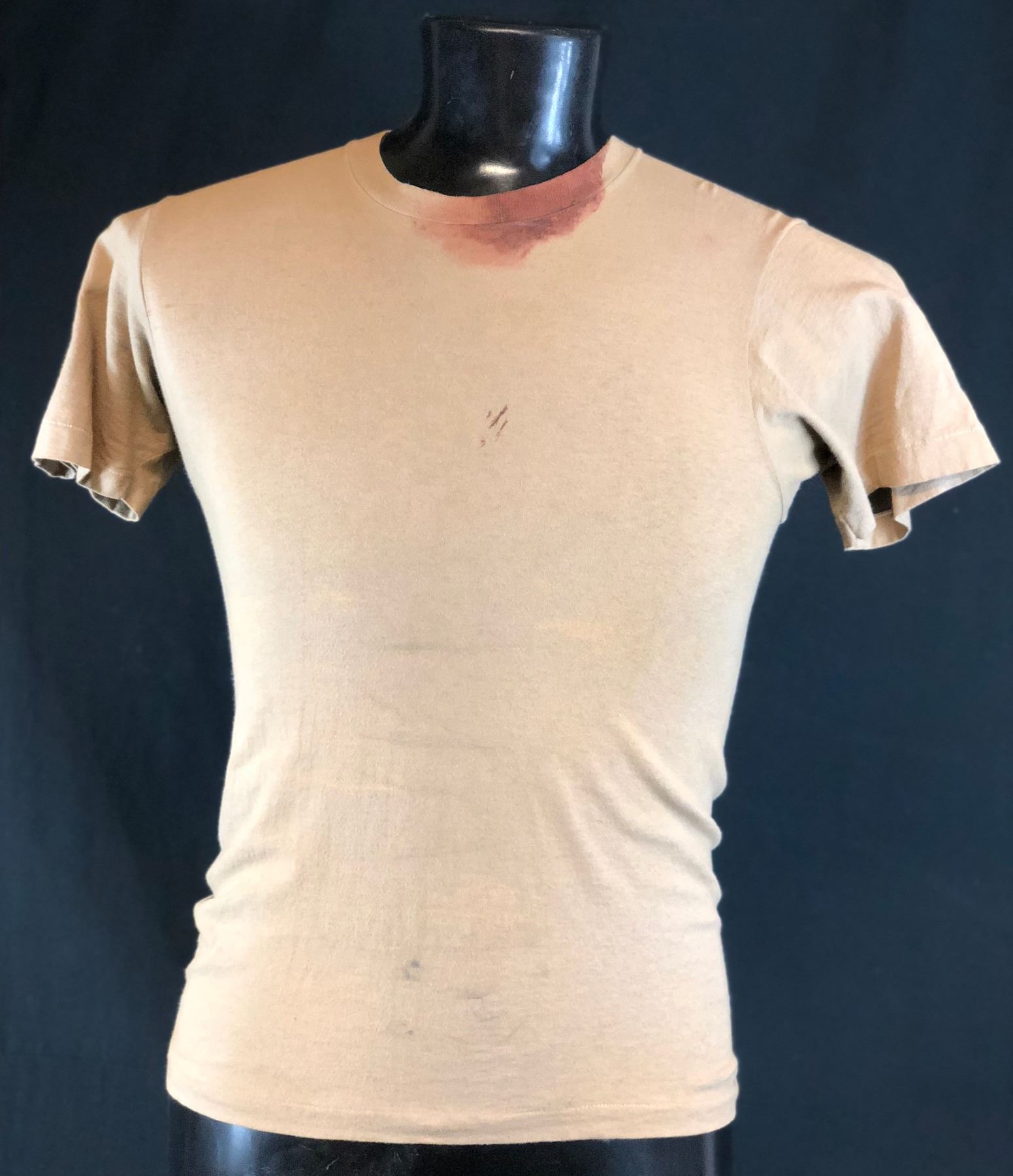 Original screen used shirt worn by "Conrad Vig", played by Spike Jonze in the comedy war film "Three Kings" (1999) written and directed by David O. Russell from a story by John Ridley, where in the aftermath of the Persian Gulf War, four soldiers set out to steal gold that was stolen from Kuwait, but they discover people who desperately need their help. The film stars George Clooney, Mark Wahlberg, Ice Cube, and Spike Jonze.