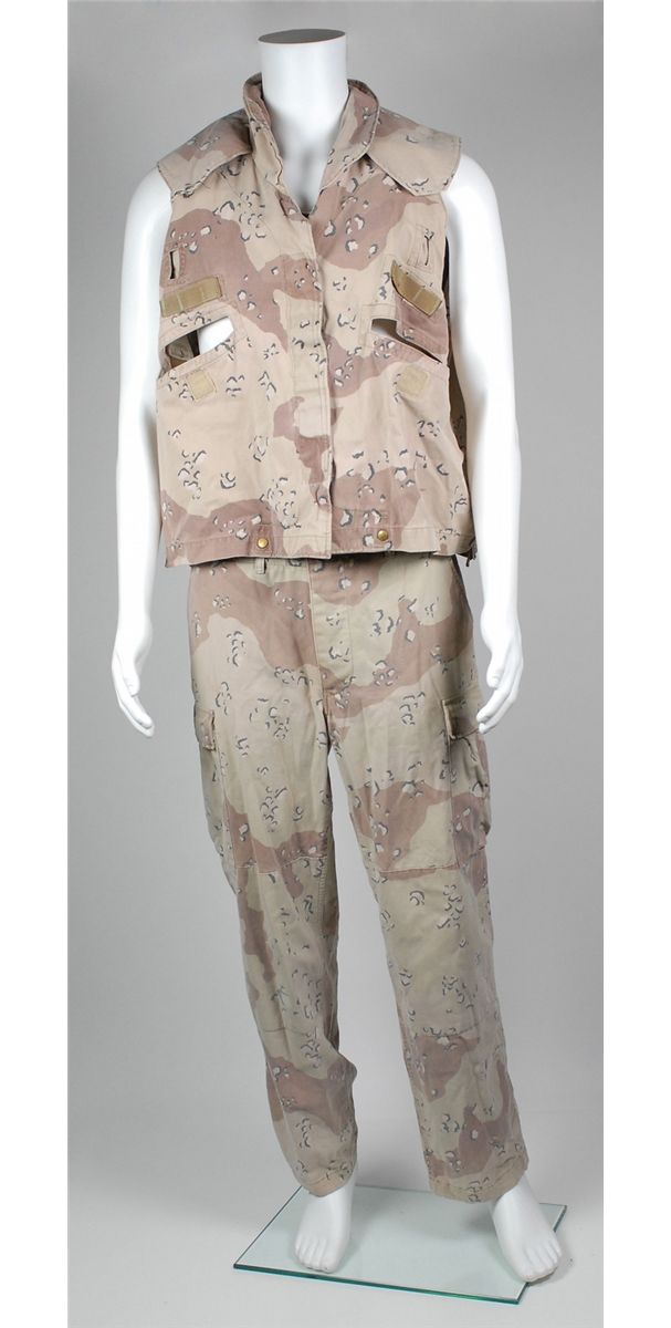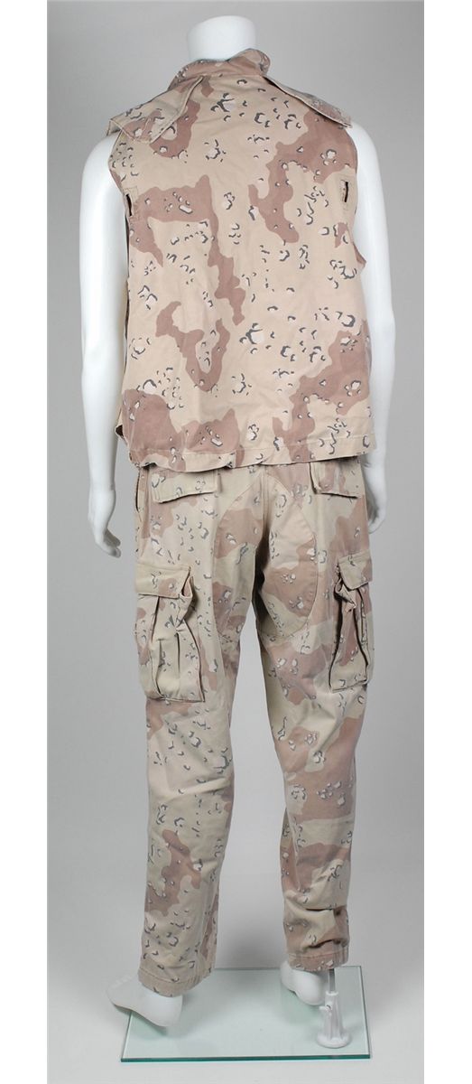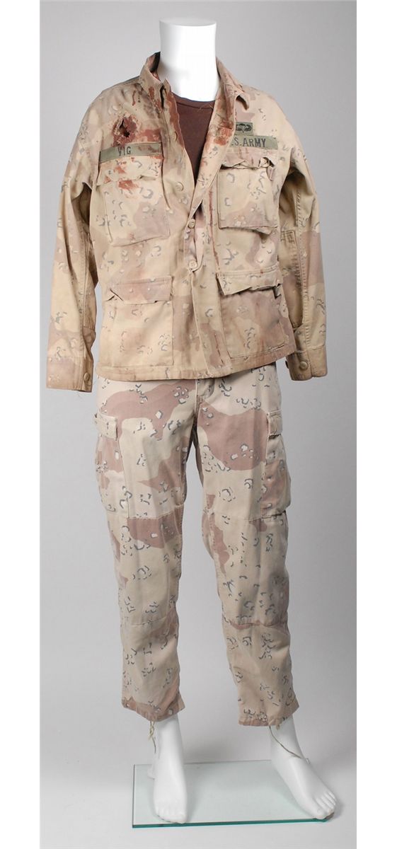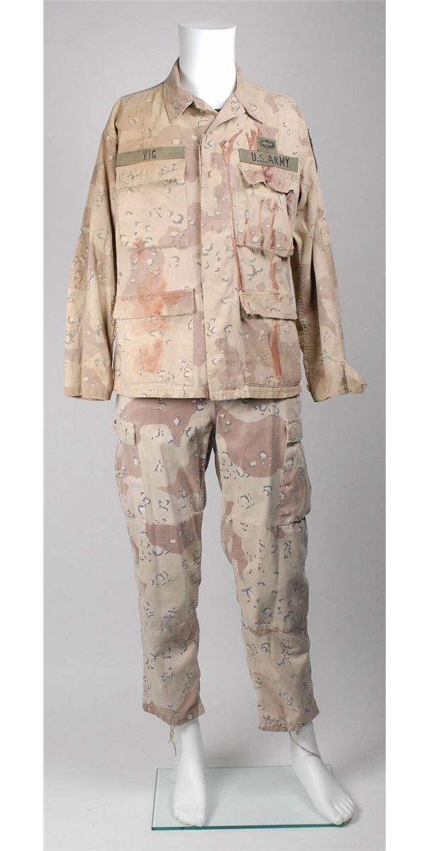 Three screen-worn costumes from the 1999 film Three Kings. Costumes are: camouflage pants and vest worn by George Clooney. Sleeveless desert camo vest features a Velcro closure front with Clooney’s character name, “Gates” written inside the collar; and a matching pair of pants, with adjustable waist straps, button-fly, and “Gates” written inside the waistband, which has since been crossed out, with Wogoman written above. Accompanied by two certificates of authenticity from Hollywood Rock–N Country, one stating that the pants were worn by Clooney as Archie gates and later by Jamie Kennedy as Walter Wogoman; military outfit worn by Spike Jonze: a long-sleeve camouflage fatigue shirt, with Army patches and a bullet hole to right shoulder, with blood to collar and upper portion of shirt; a beige blood-stained t-shirt; and matching camo pants. A second blood-stained long-sleeve camo shirt is also included, along with a pair of olive green socks and a small camo pouch. Two labels are pinned to the costume, including one to the shirt which reads, “Conrad Vig ‘Spike Jones’ Ch #9, Sc. 178–222, Vig shot, Troy shot.” The second blood-stained shirt bears another tag for a different scene. Accompanied by a letter of authenticty from Eastern Costume for the jacket, pants and t-shirt; and a certificate of authenticity from Hollywood Rock–N Country for the other shirt; and a military vest worn by Ice Cube. Desert camouflage vest has a Velcro closing front and a small blood stain to right breast. In fine condition.