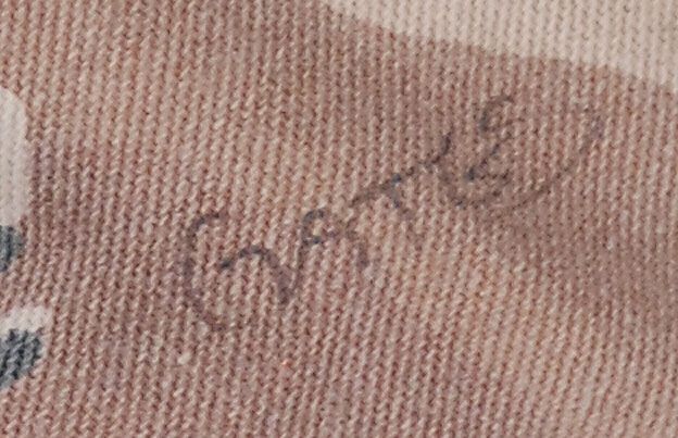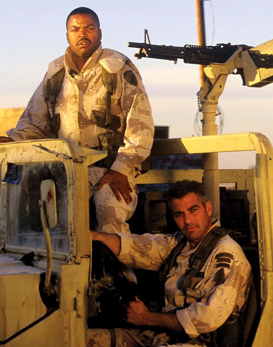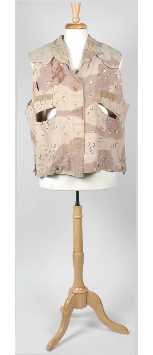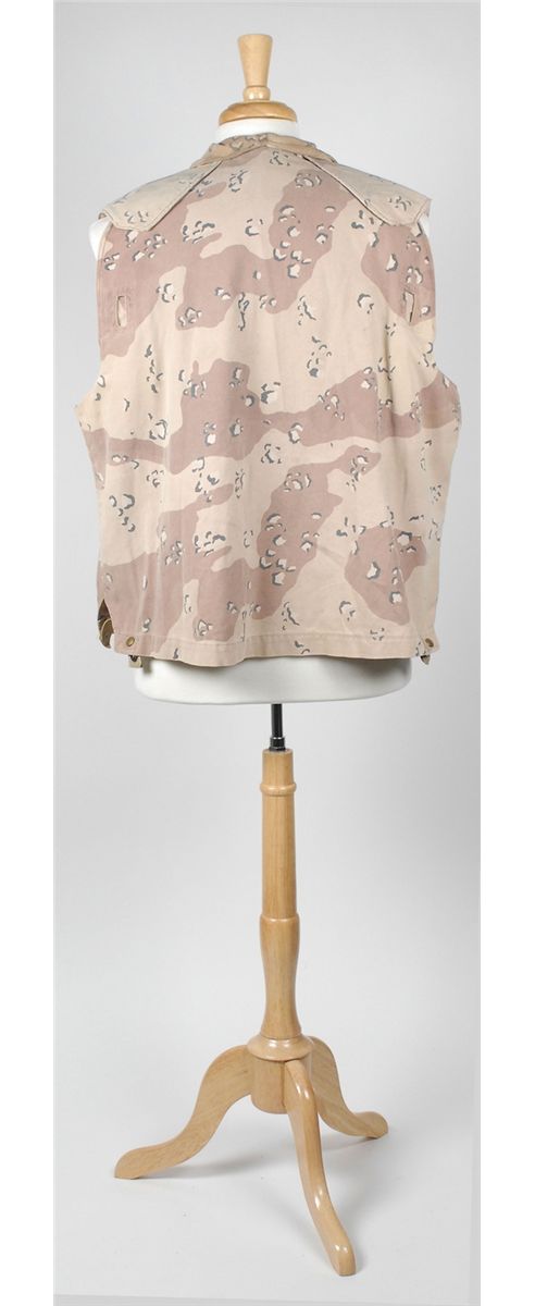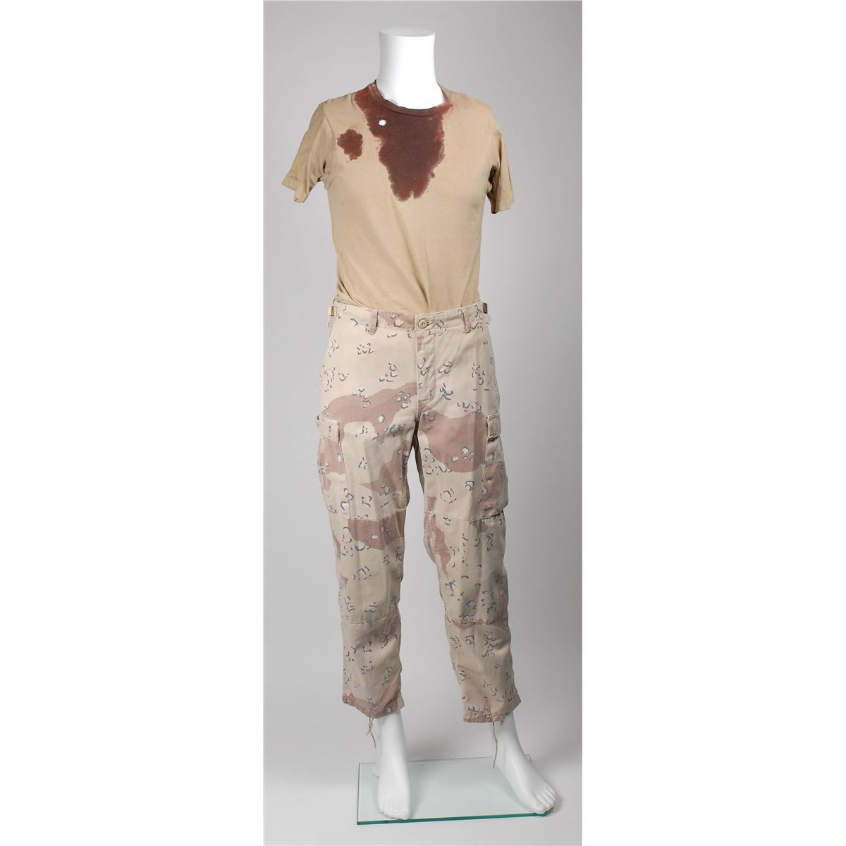 Three screen-worn costumes from the 1999 film Three Kings. Costumes are: camouflage pants and vest worn by George Clooney. Sleeveless desert camo vest features a Velcro closure front with Clooney’s character name, “Gates” written inside the collar; and a matching pair of pants, with adjustable waist straps, button-fly, and “Gates” written inside the waistband, which has since been crossed out, with Wogoman written above. Accompanied by two certificates of authenticity from Hollywood Rock–N Country, one stating that the pants were worn by Clooney as Archie gates and later by Jamie Kennedy as Walter Wogoman; military outfit worn by Spike Jonze: a long-sleeve camouflage fatigue shirt, with Army patches and a bullet hole to right shoulder, with blood to collar and upper portion of shirt; a beige blood-stained t-shirt; and matching camo pants. A second blood-stained long-sleeve camo shirt is also included, along with a pair of olive green socks and a small camo pouch. Two labels are pinned to the costume, including one to the shirt which reads, “Conrad Vig ‘Spike Jones’ Ch #9, Sc. 178–222, Vig shot, Troy shot.” The second blood-stained shirt bears another tag for a different scene. Accompanied by a letter of authenticty from Eastern Costume for the jacket, pants and t-shirt; and a certificate of authenticity from Hollywood Rock–N Country for the other shirt; and a military vest worn by Ice Cube. Desert camouflage vest has a Velcro closing front and a small blood stain to right breast. In fine condition.