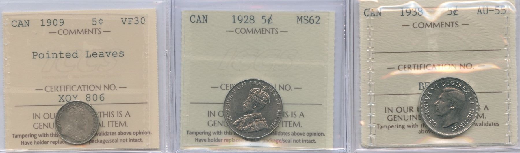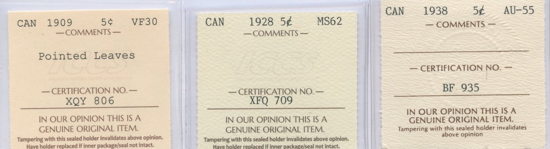 1909 ICCS VF30; Pointed Leaves. || 1928 ICCS MS62. || 1938 ICCS AU-55; Older embossed 2-letter certificate. 3 Pcs.