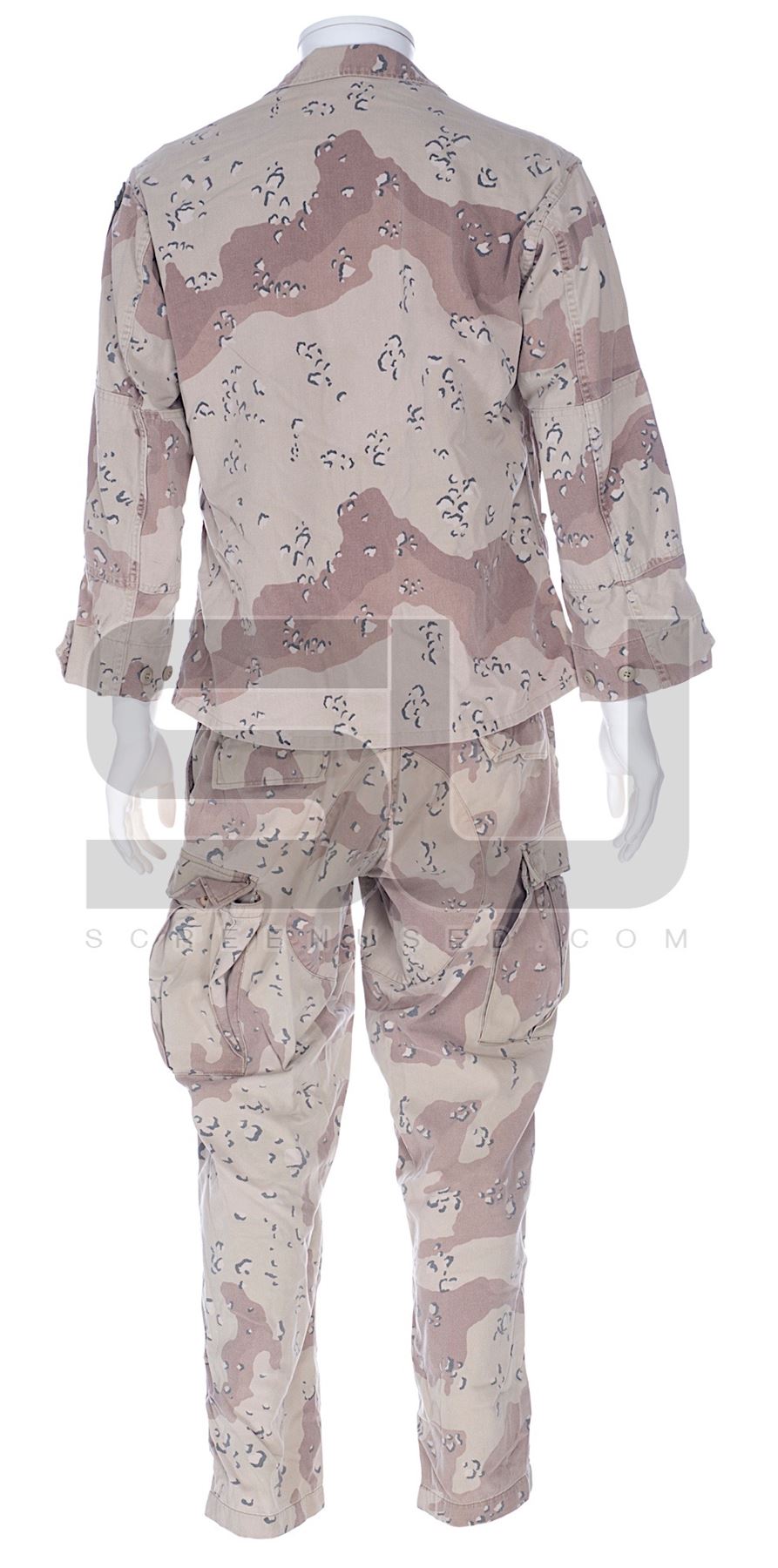This uniform was acquired by the production for use by Mark Wahlberg as "Troy Barlow". The uniform consists of a sand beige camo uniform top (size M) and pants (size M), and a brown T-shirt (size M). The character's name patch is applied to the shirt along with several other patches.