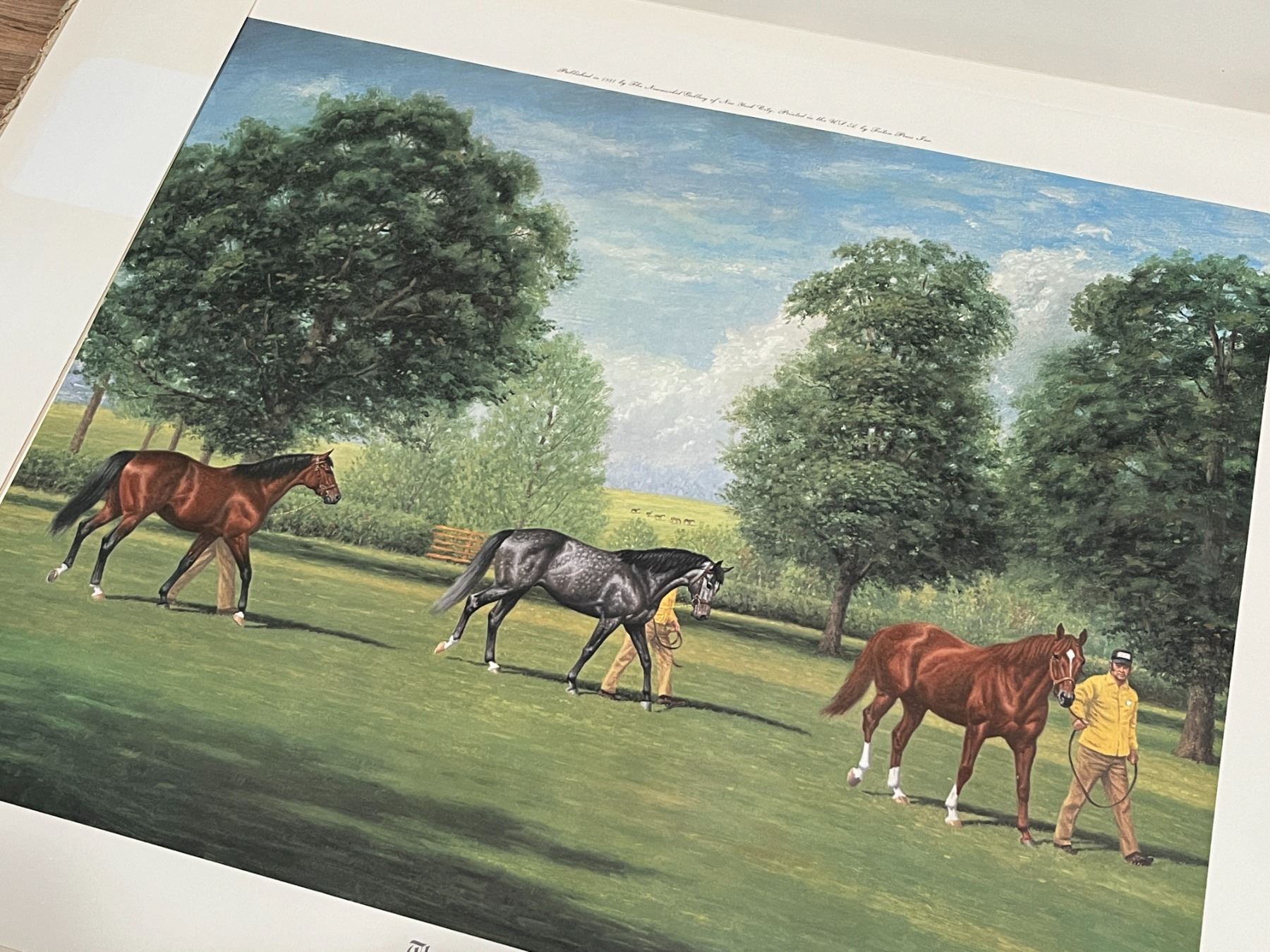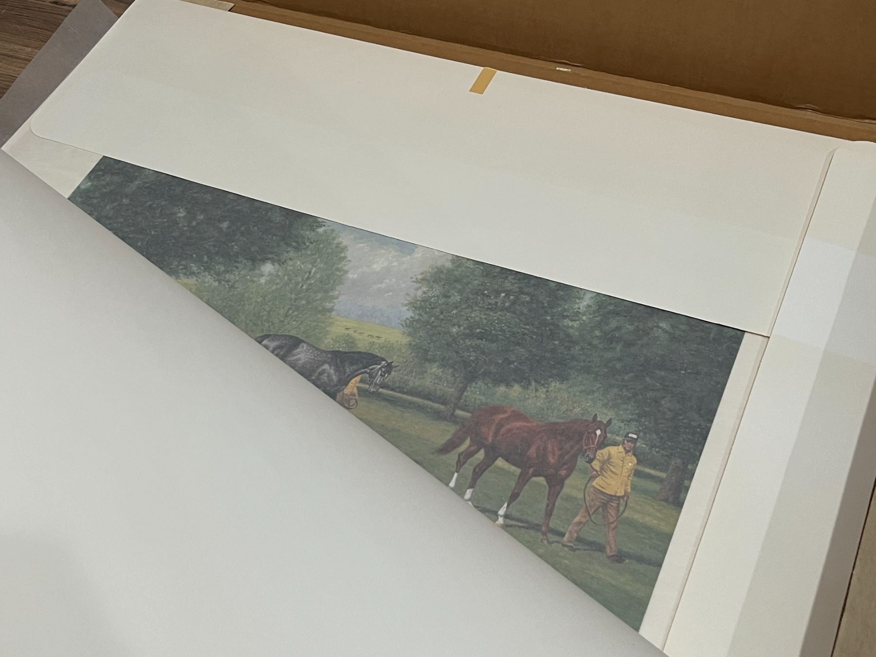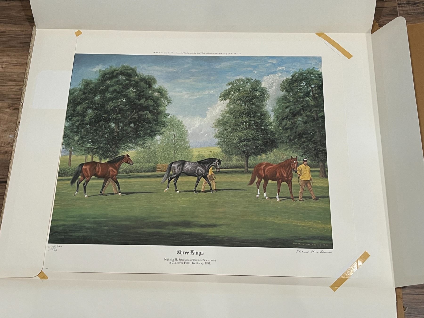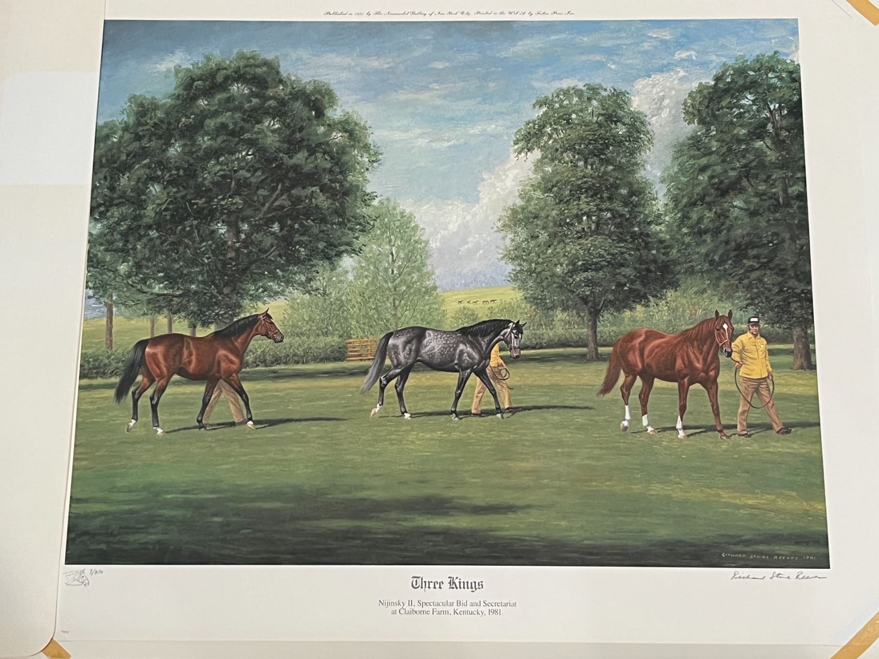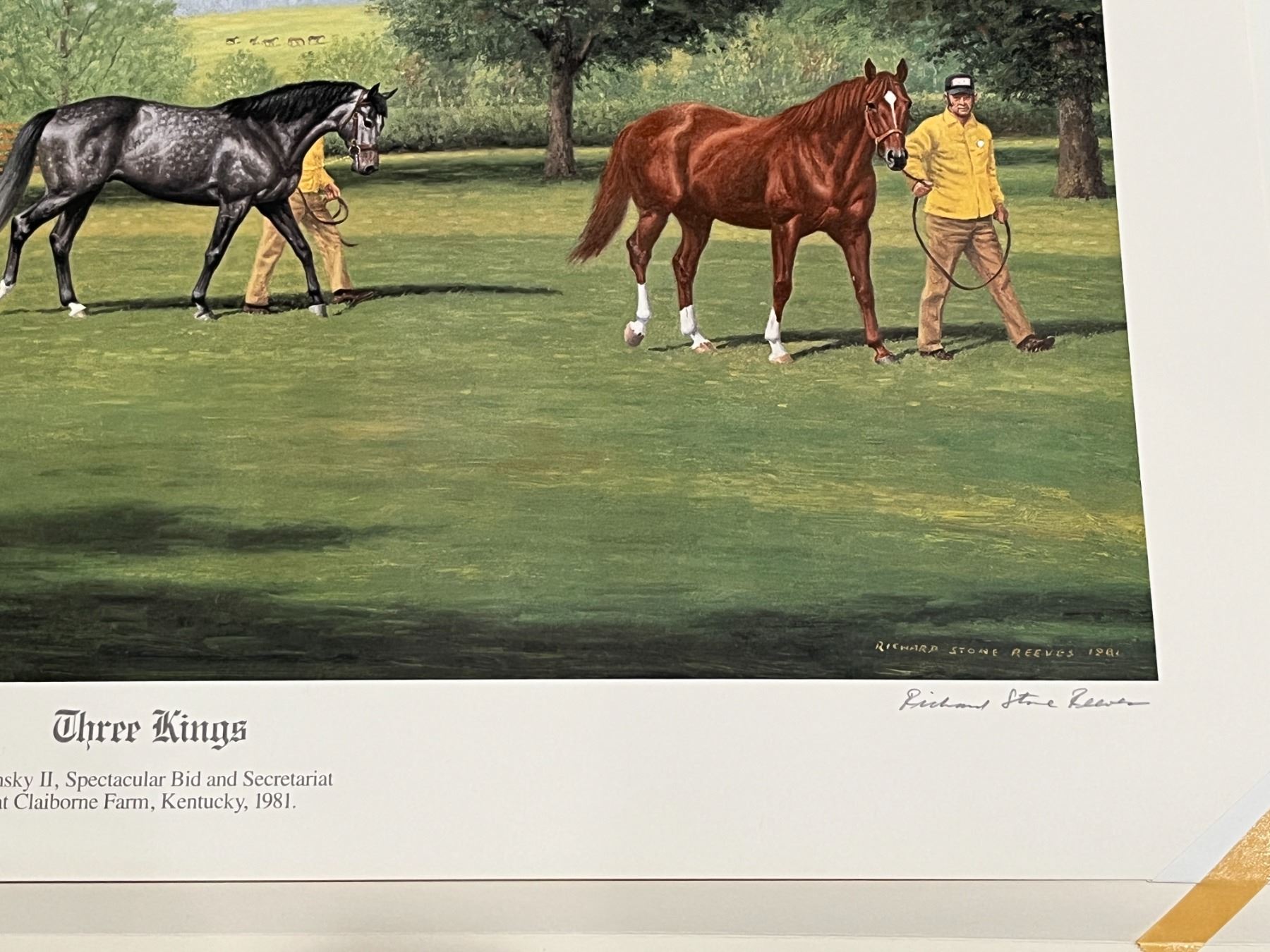 APPRAISER FAIR MARKET VALUE: $1,400 - "Three Kings" by Richard Stone Reeves (1919-2005): Limited edition lithograph (#3/850) depicting the famed thoroughbreds Nijinsky II, Spectacular Bid, and Secretariat. Hand-signed and numbered by the artist. Pencil Remarque of a horse's head in lower-left margin. Measures approximately 22" high by 26.5" wide unframed. (Print has never been framed, has been stored in a secure box to protect) LT31