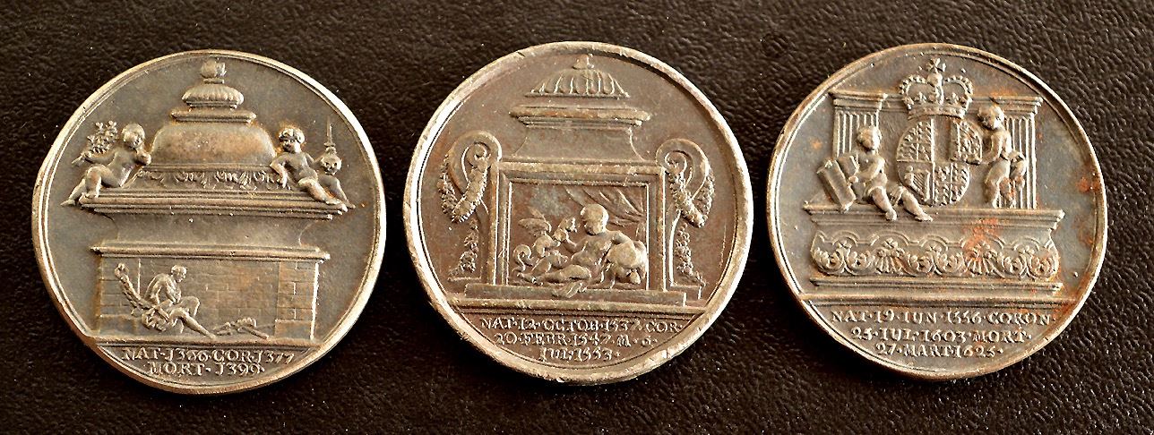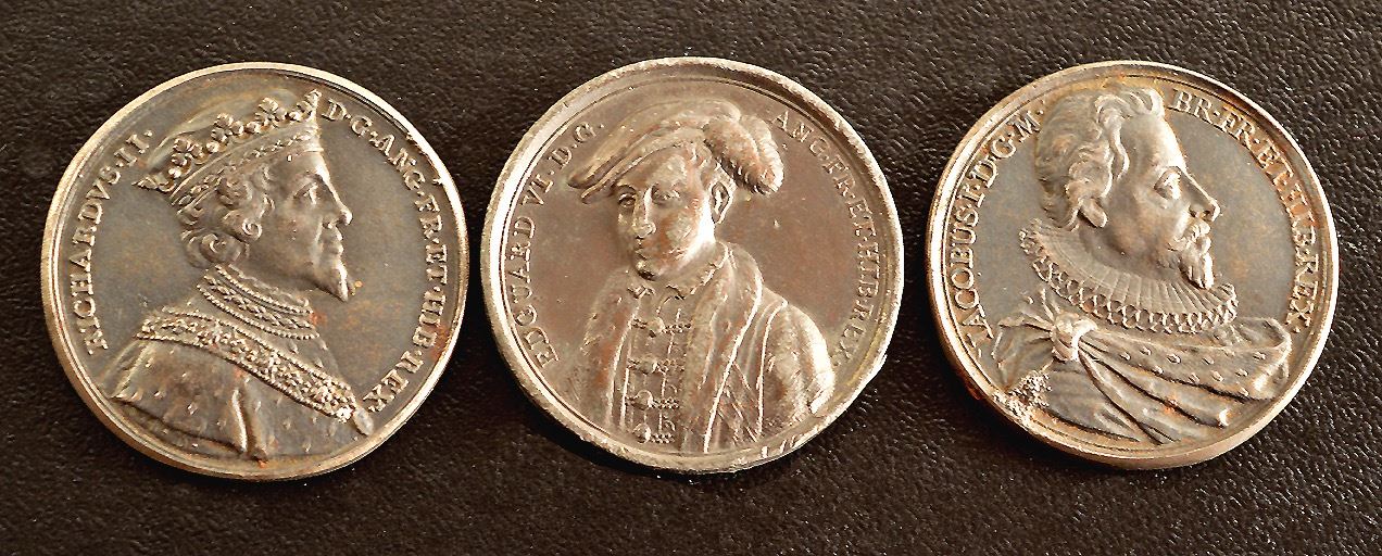 The Kings and Queens of England, by E. Thomason and J. Dassier and by J. Marrian, from a total issue of 36 different medals, covering the reign of William I to George IV. Issued in 1830, three medals are offered here: Richard II, Born 1367, Crowned 1377, died 1400, medal #12 in series; Edward VI, born 1537, crowned 1547, died 1553, medal #22; James I, born 1556, crowned 1603, died 1625, medal #24; All Wm, 40mm, Fine, or so, with edge bumps and/or spots/stains; total of 3 medals