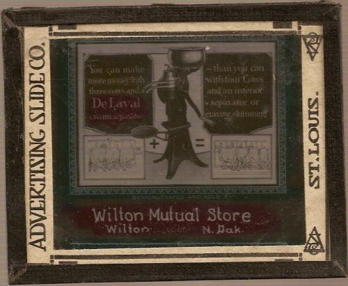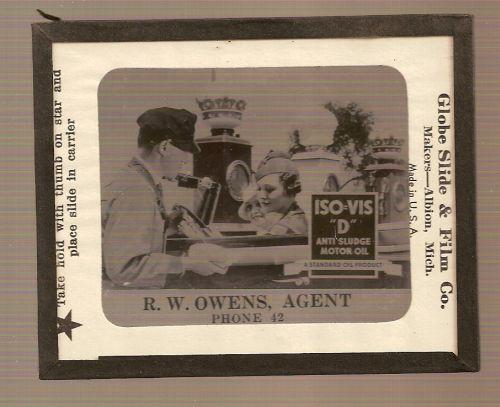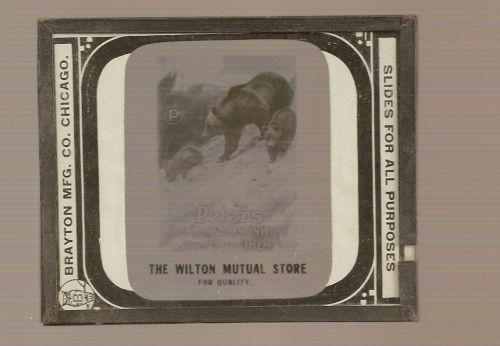Three Lantern Slide Plates in box bearing the name Eastman Lantern Slide Plates. Box is soiled and worn. Images include: (1) Brayton Mfg. Co. Chicago - Peter’s Big Game Ammunition - 3 bears going doing mountain. (2) Adv. Slide Co., St. Louis - DeLaval Cream Separator. (3) Globe Slide & Film Co -Iso-Vis D Anti Sludge Motor Oil R.W. Owens Agent Phone 42