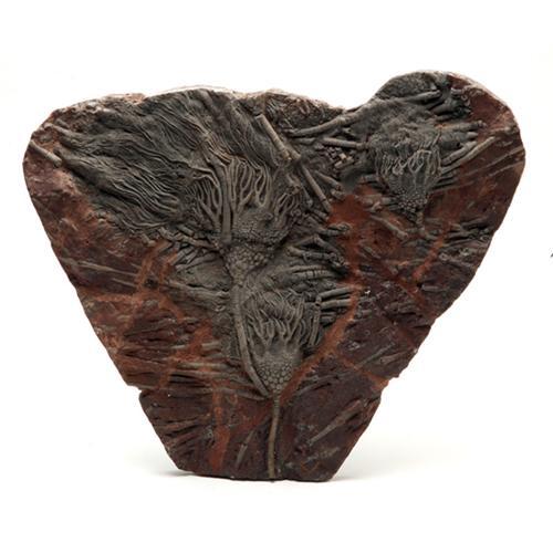 <Our item number 111426><B>Three Large Floating Crinoids.</B> Found in Erfoud, Morocco, this large 15x13 inch slab contains three complete large Scyphocrinites crowns, the two largest being 4 inches long with exquisite delicate detail. These dark grey crinoids even still have some of their stems still attached. Close examination reveals the detailed feather-like feeding arms and small star-shaped calcite plates. Crinoids are related to star fish and are known as "sea lilies" because they resemble palnts more than animals. Scyphocrinites were an interesting floating crinoid with its stem attached to around air-filled bulb that floated on thesurface of the ocean. When the crinoids died, they would separate from their flotation bulbs and settle on the ocean bottom. This esthetic grouping of 475 million year old crinoids would make a fine addition to any fossil collection.<BR><BR>Add $25 for domestic shipping. <BR>Estimated Value $450-700. <BR><BR>Our item number 111426<BR><IMAGES><P ALIGN="CENTER "><IMG SRC="http://64.60.141.195/photos/40jpegs/111426.jpg"> </P></IMAGES>