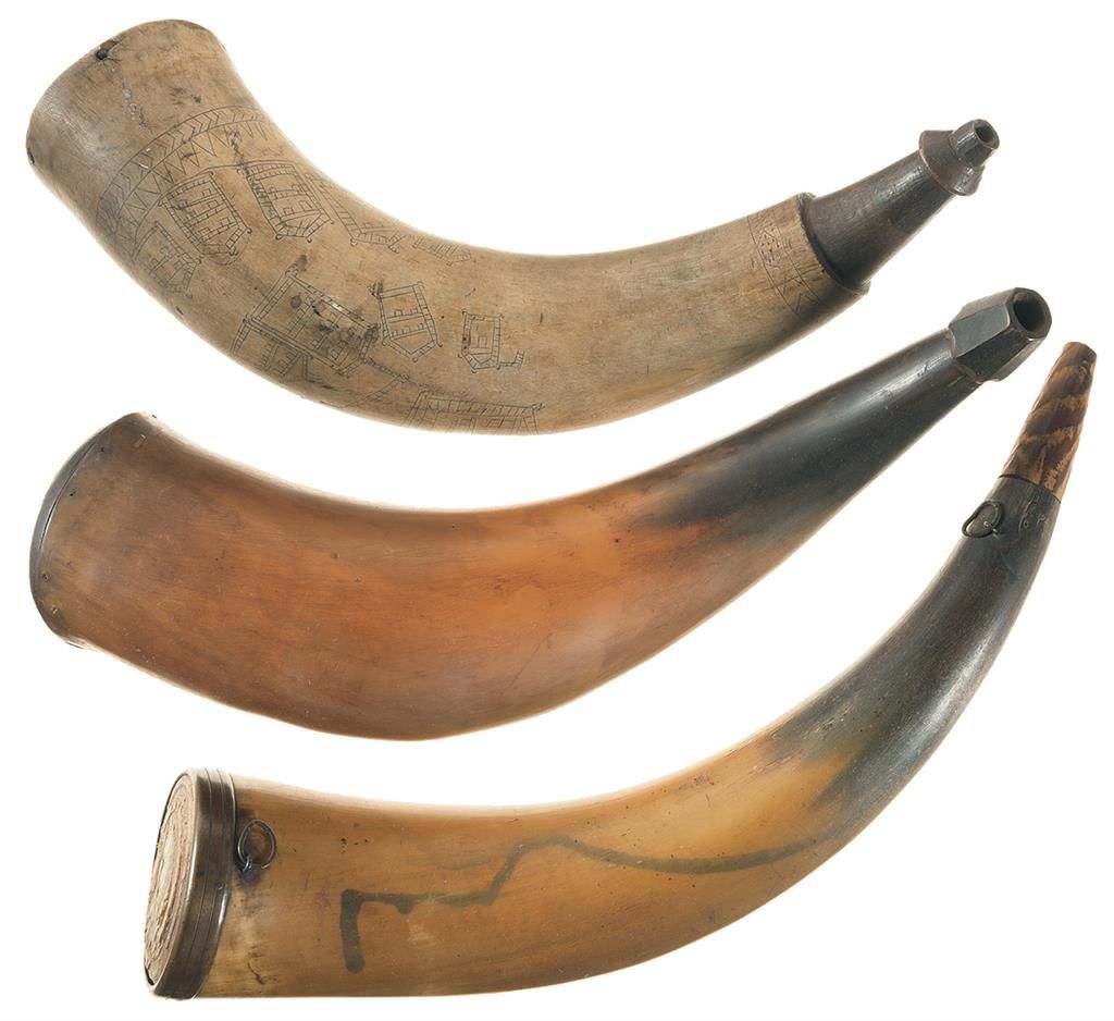 1) 12" long powder horn. 2) 13" long powder horn. 3) 11 1/2" long powder horn with crude village scene. Very good plus.