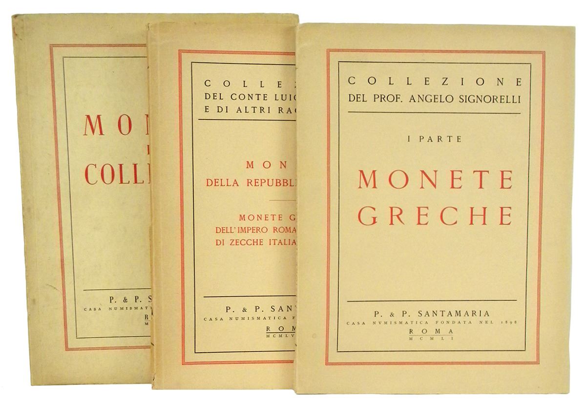 Santamaria, P. & P. COLLEZIONE DEL PROF. ANGELO SIGNORELLI. I PARTE: MONETE GRECHE. Roma, 25 Ottobre 1951. (6), 54 pages; 613 lots; 18 fine plates. [with] Santamaria, P. &. P. COLLEZIONE DEL CONTE LUIGI BRUNACCI E DI ALTRI RACCOGLITORE... Roma, 24 Febbraio 1958. (4), 140 pages; 1467 lots; 30 fine plates. Valuations list bound in. [with] Santamaria, P. & P. MONETE PER COLLEZIONE. GRECHE, ROMANE E BIZANTINE, ITALIANE MEDIOEVALI, MODERNE E CONTEMPORANEE, PROVE E PROGETTI DI MONETE ITALIANE. Roma, 4 Maggio 1961. (48) pages; 701 lots; 43 fine plates with facing text. Valuation list laid in. Three catalogues, all 4to, original printed card covers. Very good to fine copies. See catalogue for full description.