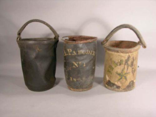 Three leather fire buckets, fair to good cond.