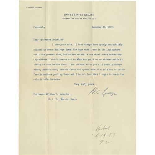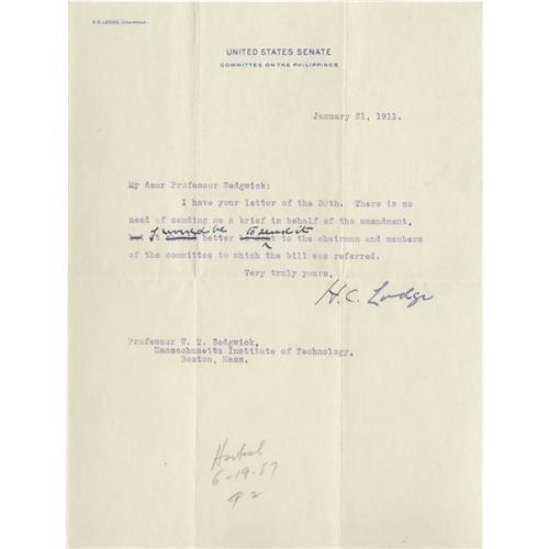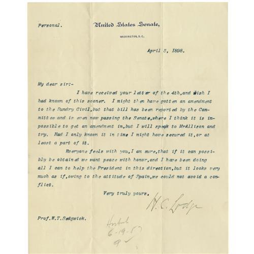 <B>Three Significant-Content Letters Signed by Important Massachussetts Senator Henry Cabot Lodge (1850-1924)</B></I> All on U.S Senate letterhead, and dating from 1898, 1909, and 1911. Each approximately 8.0" x 11.0" size, and in very fine condition with minor pencil notations. All three are written to a Prof. William Sedwick at M.I.T. The first, dated April 5, 1898, apparently refers to a letter Sedwick had sent which might have affected a bill already passed by the Senate. It presumably had to do with foreign affairs, for Lodge Concludes, <I>"Everyone feels with you, I am sure, that if it can possibly be obtained we want peace with honor, and I have been doing all I can to help the President in this direction, but it looks very much as if, owing to the attitude of Spain, we could not avoid a conflict.</B></I>" The second declines to sign an Anti-Woman Suffrage petition as a matter of procedure, but assures Sedwick that <I>"I have been always openly and publicly opposed to Woman Suffrage...</B></I>" The third refers to a brief Sedwick had sent him regarding a Senate bill. From the Henry E. Luhrs Collection. Accompanied by LOA from PSA/DNA.