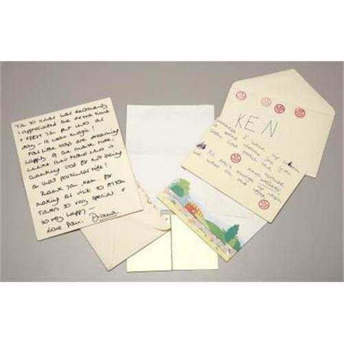 <B>Three Letters Written by Princess Diana, Prince William, and Prince Henry to Ken Wharfe, Inspector of Police at Kensington Palace</B></I><BR><BR>The letters thank him for organizing a private visit to Alton Towers amusement park in 1990, each with original envelopes, Princess Diana's and Prince William's letter on Kensington Palace stationary with crowned insignia <I>D </B></I>for Diana, Princess of Wales (1961-1997), dated October 24, 1990, the latter decorated with red happy faces on the card and envelope, Prince Henry's letter depicting a policeman with his cat, in pencil: <I>Dear Ken and all the Policemen Thank you for a wonderful day. I loved the Bob sleigh best Love Harry</B></I>-largest measuring 4x6 in.Prince Henry commonly known as Harry.<BR><BR>Provenance:<BR>Purchased from Hope & Glory, London<BR><BR><b>Shipping:</b> Requires 3rd Party Shipping (<a target="_blank" href="http://www.heritageauctions.com/common/shipping.php">view shipping information</a>)