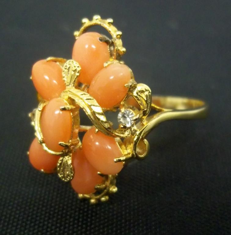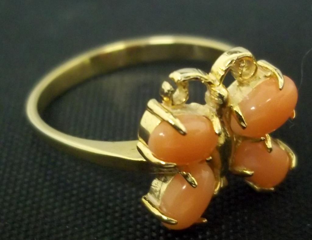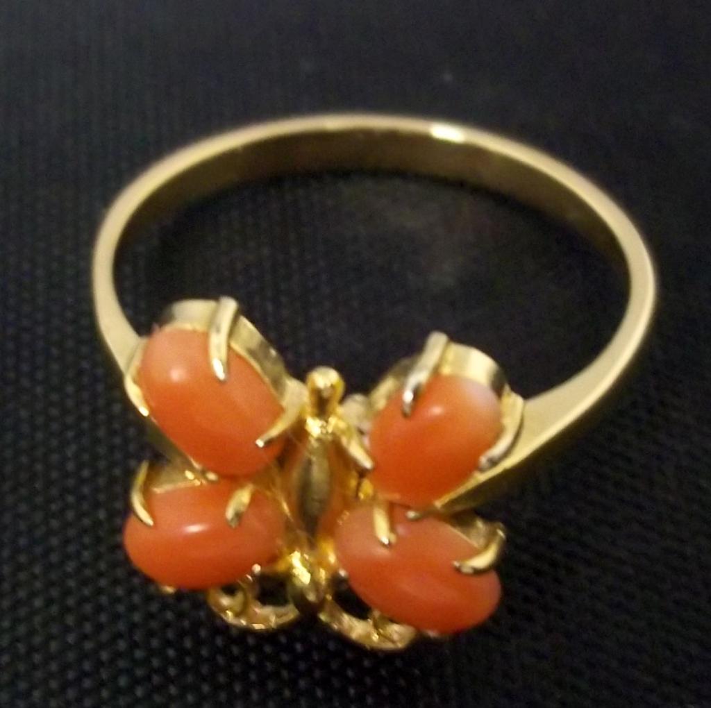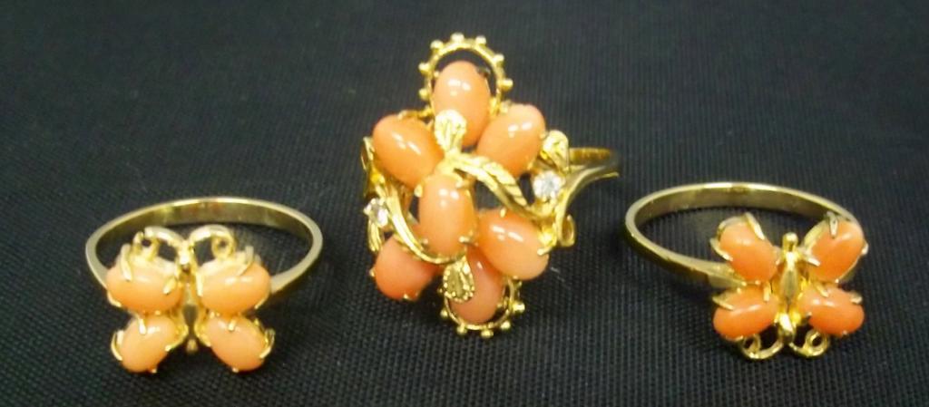 Each of these rings is made with light coral from Hawaii. Two of the rings have a cute butterfly design and the third ring is a fancy design with seven pieces of coral.