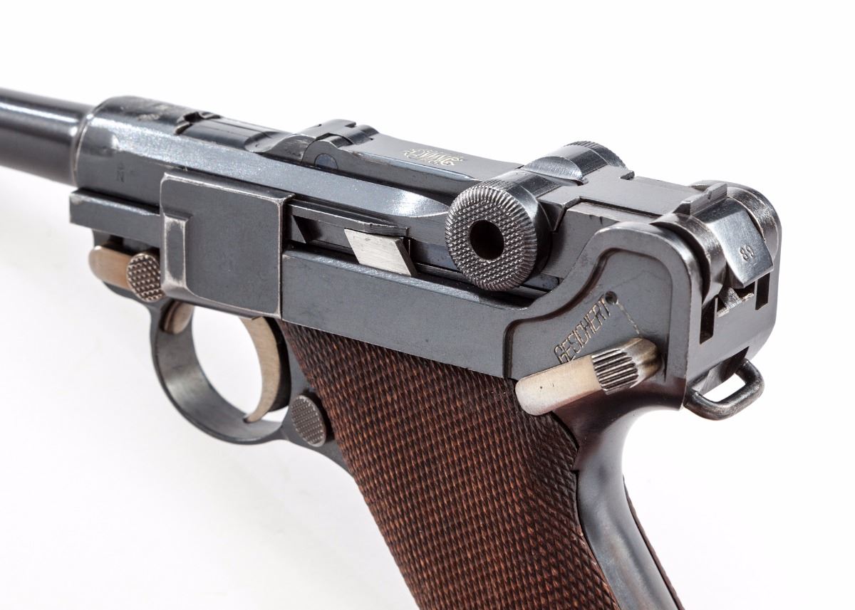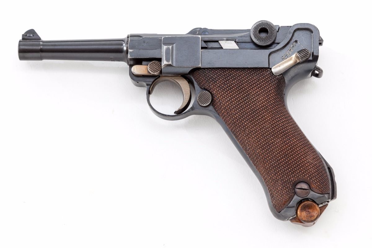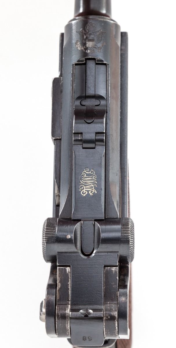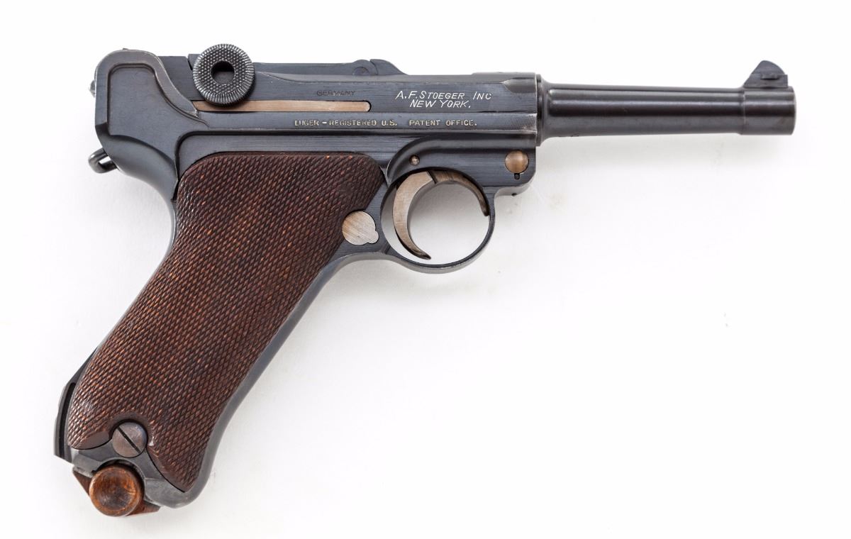 Three-Line Stoeger American Eagle Luger, #4389i, .30 Luger cal., 3-3/4'' barrel, blue finish, straw small parts, factory checkered walnut grips, with one tin-plated wood based magazine marked ''Germany''; right side of upper receiver marked ''Germany/ A.F. Stoeger Inc. / New York''; lower frame marked ''Luger - Registered U.S. Patent Office.'' American eagle to chamber, DWM to toggle, extractor marked ''Geladen'', safety marked ''Gesichert'', ''(crown)/N'' proofmarks to left side upper receiver. Condition is fine to near excellent retaining approx. 92%-94% rust blue with minor thinning to straw parts. Fire blued grip screws have toned mostly brown. Grips remain crisp with light flattening to top of checkers. All visible matching numbers. Action is good, bore is bright. Est.: $4,000-$6,000. (C&R)