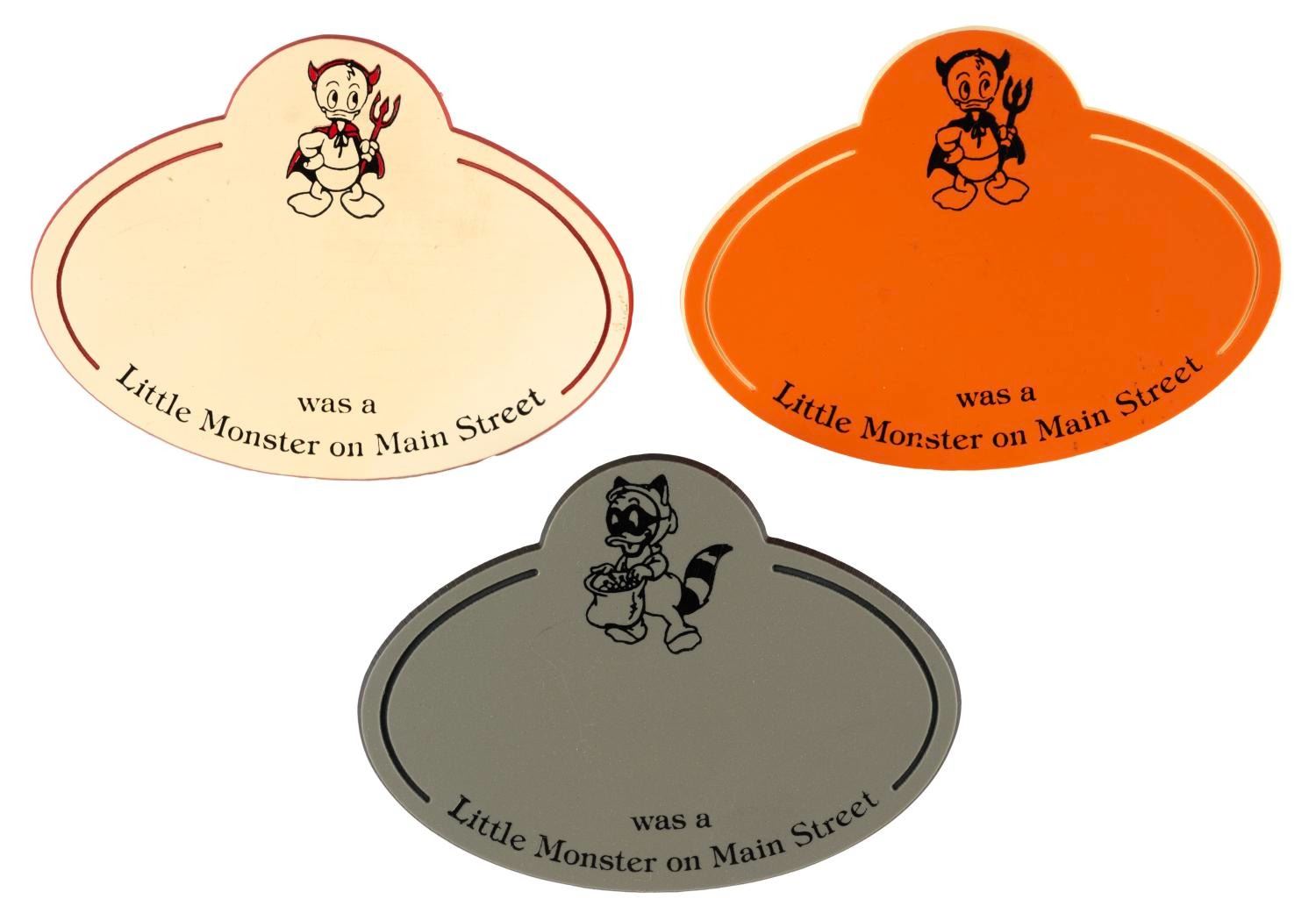 (Disneyland, 1993-95) Three name badges from the Little Monster on Main Street annual Halloween event for Cast Members and their families. Measuring 2” x 2.5” each, the three name badges are in good to very good condition with scratches and light wear.