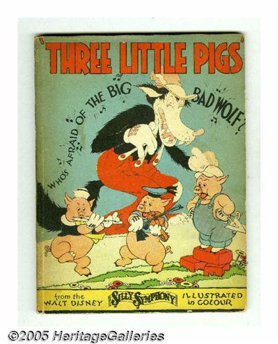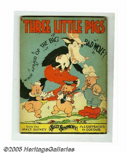 <B>Three Little Pigs - British (Walt Disney Mickey Mouse Limited, 1934).</B></I> While veteran Disney collectors are familiar with the attractive Blue Ribbon Books edition of <B>Three Little Pigs</B></I>, offered here is the much scarcer British edition! Published by Mickey Mouse Limited in 1934, the wonderful cover illustration is truly reflective of the joy and spontaneity of the early Disney cartoon. With a pulp stock interior and black and white Disney studio illustrations, the square bound covers are made of a heavier slick stock. The spine is complete. Book has a few very light spots, some light aging - really a tough one to find! <I>From the Larry Jacobs Collection.</B></I>
