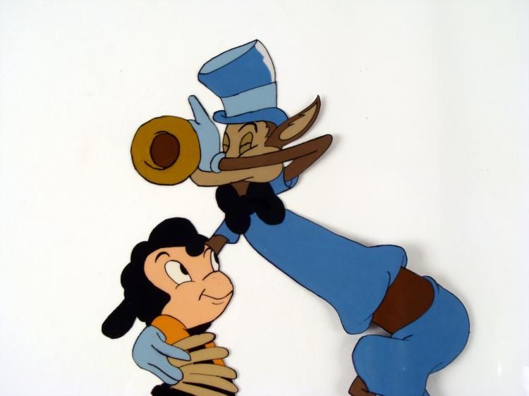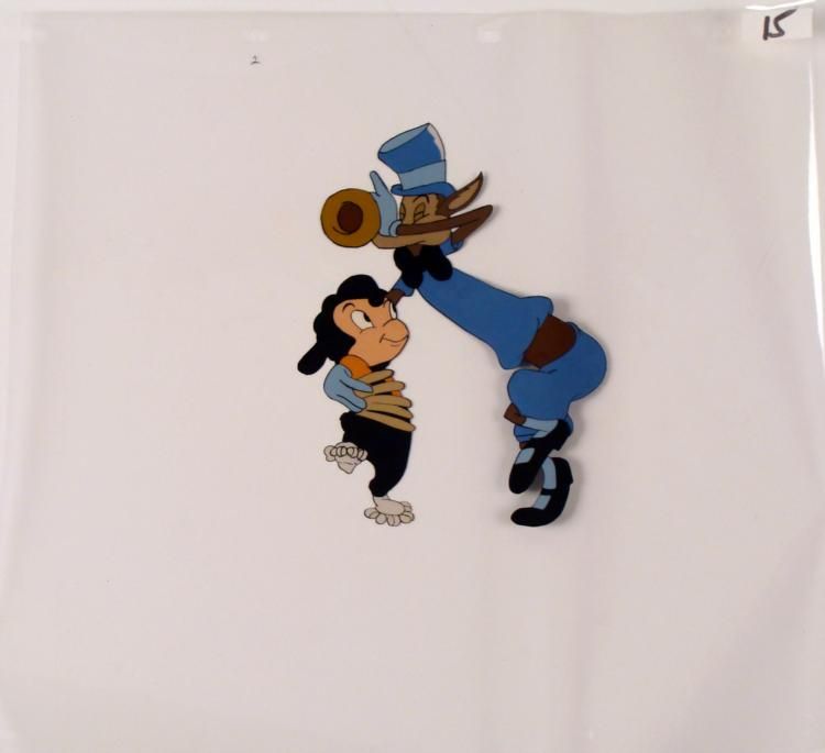 This is an original animation cel from the production of a Three Little Pigs animated cartoon. How can anyone resist a wolf when he plays the trumpet so eloquently and hits every note perfectly?? The pig apparently hasn't left yet... Medium: Hand painted acetate cel Cel size: 13 x 14 inchesDetails: Numbers, top of celCondition: Very good; it has been stored.