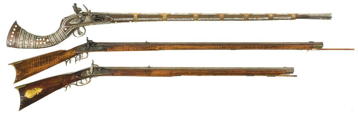 A) Flared muzzle, metal cleaned, extensive mother of pearl inlaid pattern on stock (some inlays are missing), several minor cracks in stock.