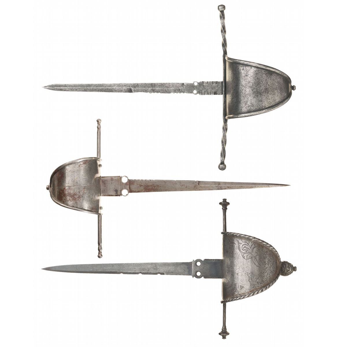1) Main-gauche, 21 1/2 inches overall with a 17 inch blade, thumbrest ricasso, 12 inch straight crossguard, wire wrapped grip, disc pommel and a rolled-edge knuckleguard decorated with a single engraved vertical line. 2) Main-gauche, 19 1/2 inches overall, with a 13 7/8 inch blade, 11 inch crossguard, knuckle guard with etched decoration of a knight on horseback, carved hardwood grip and carved floral themed pommel. 3) Main-gauche, 20 inches overall with a 14 1/2 inch blade, 13 inch twisted crossguard, unadorned knuckle guard, twisted wire grip and a disc pommel. Provenance: The William Ashby Collection