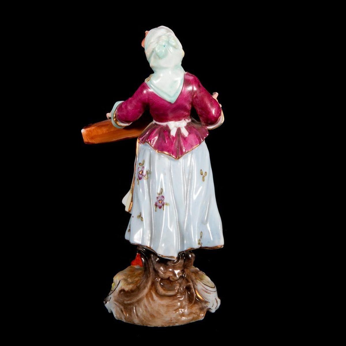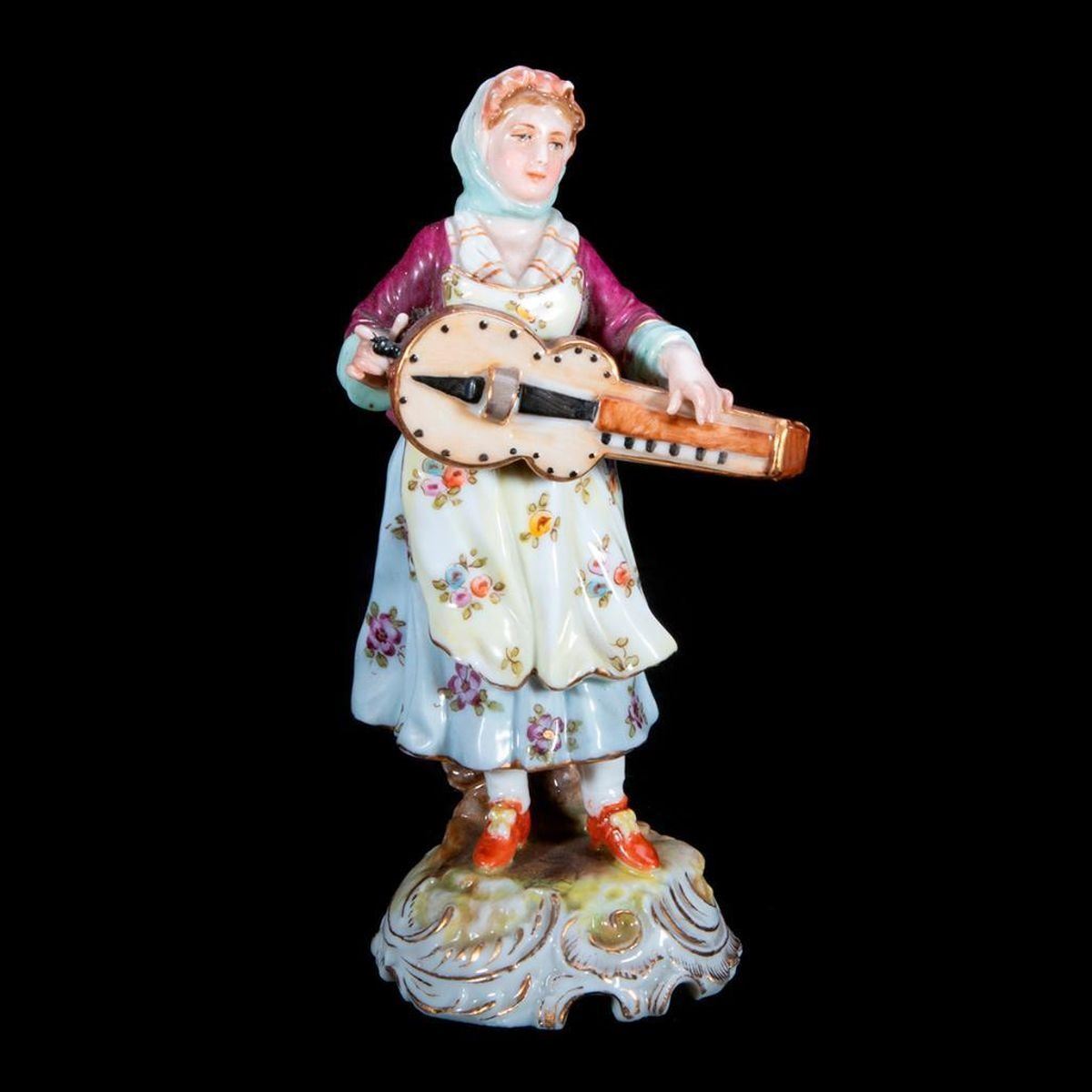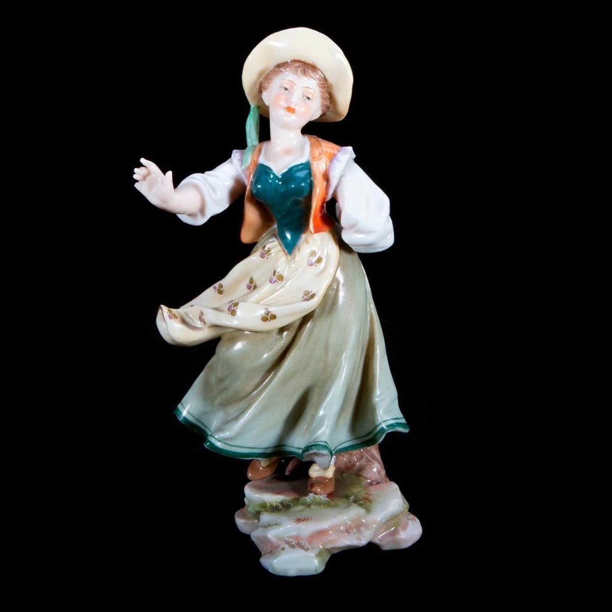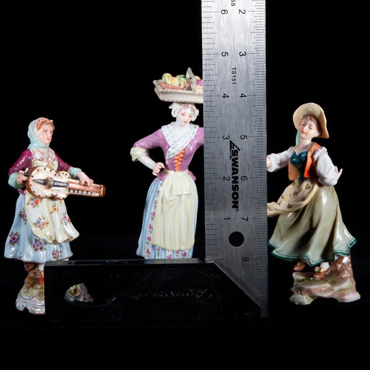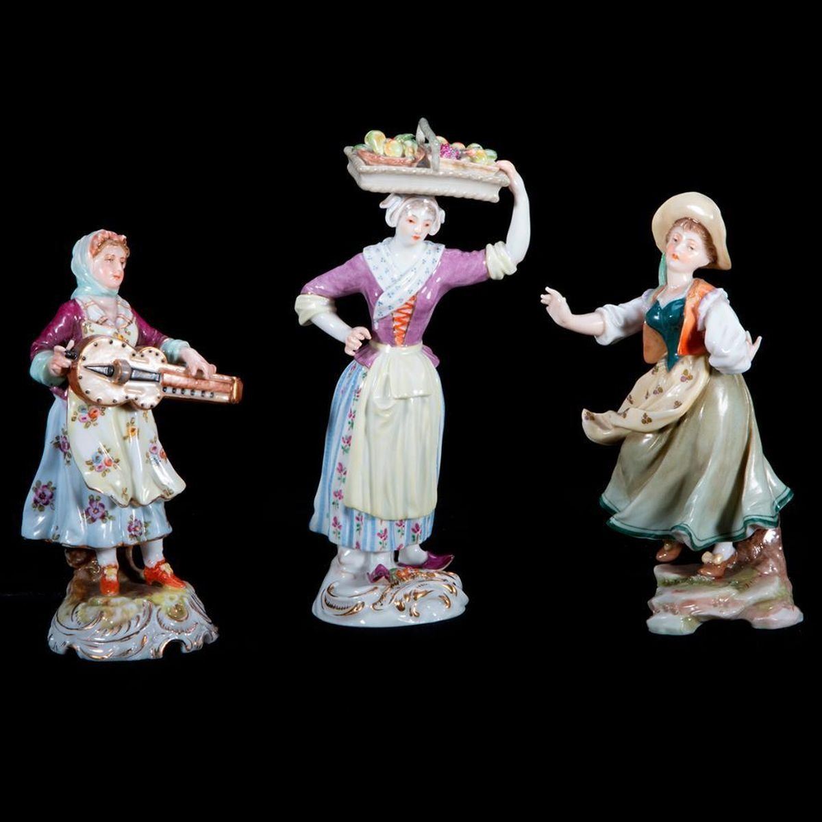 Three Meissen Figures, vegetable seller, dancing woman, musician. Tallest-5.75" Condition: dancing woman missing small finger on right hand. All others are very good.
