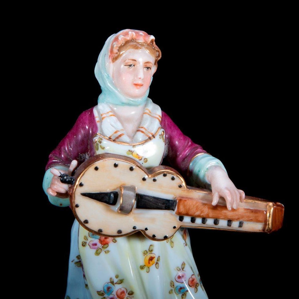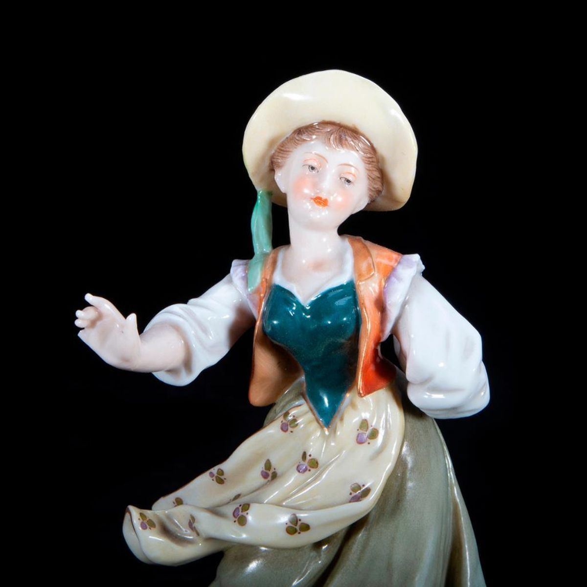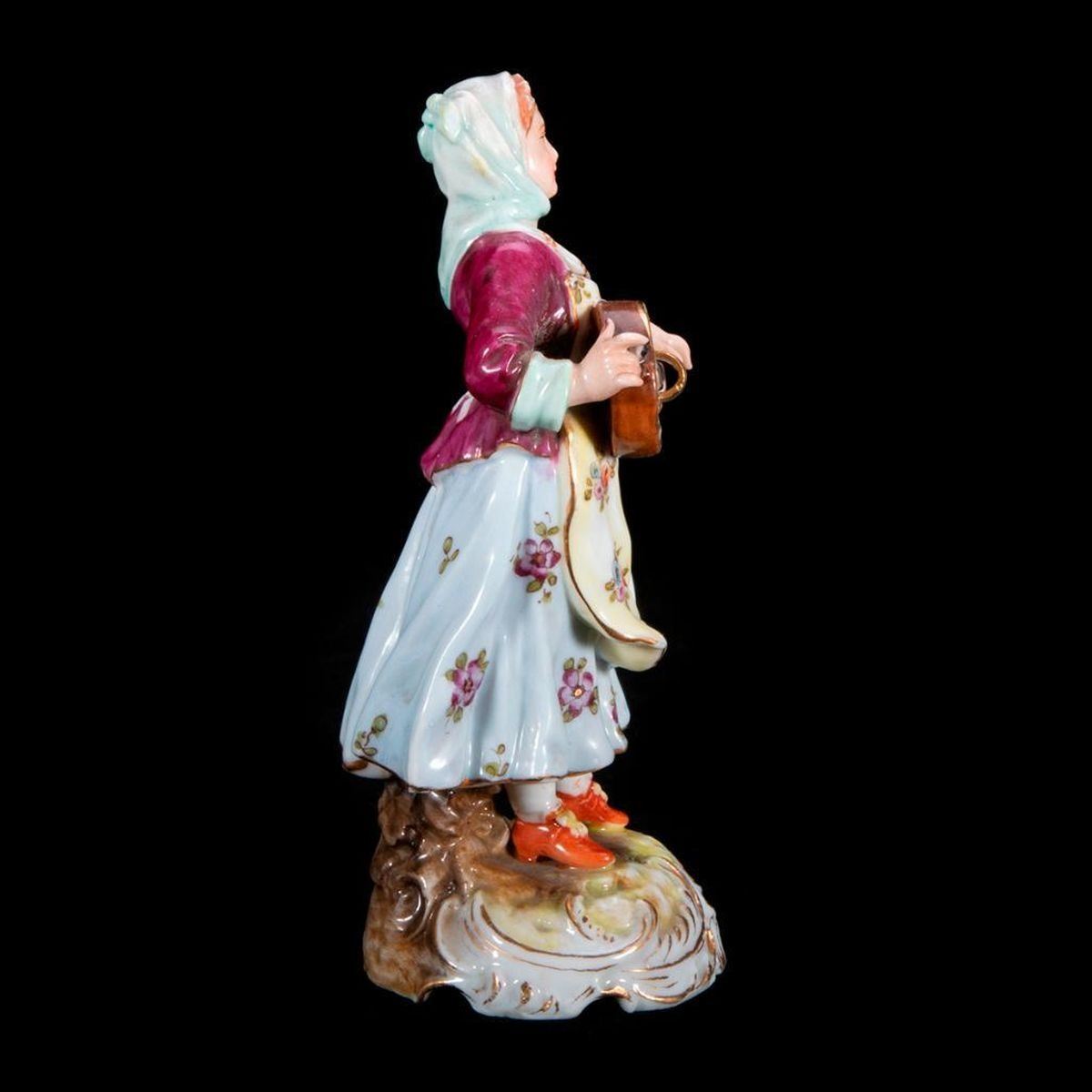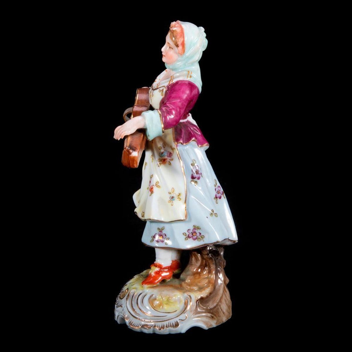Three Meissen Figures, vegetable seller, dancing woman, musician. Tallest-5.75" Condition: dancing woman missing small finger on right hand. All others are very good.