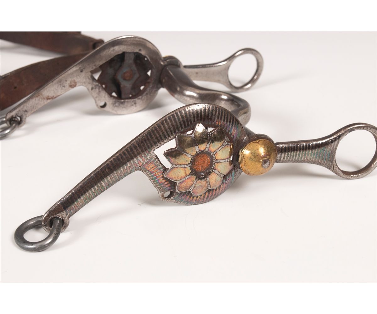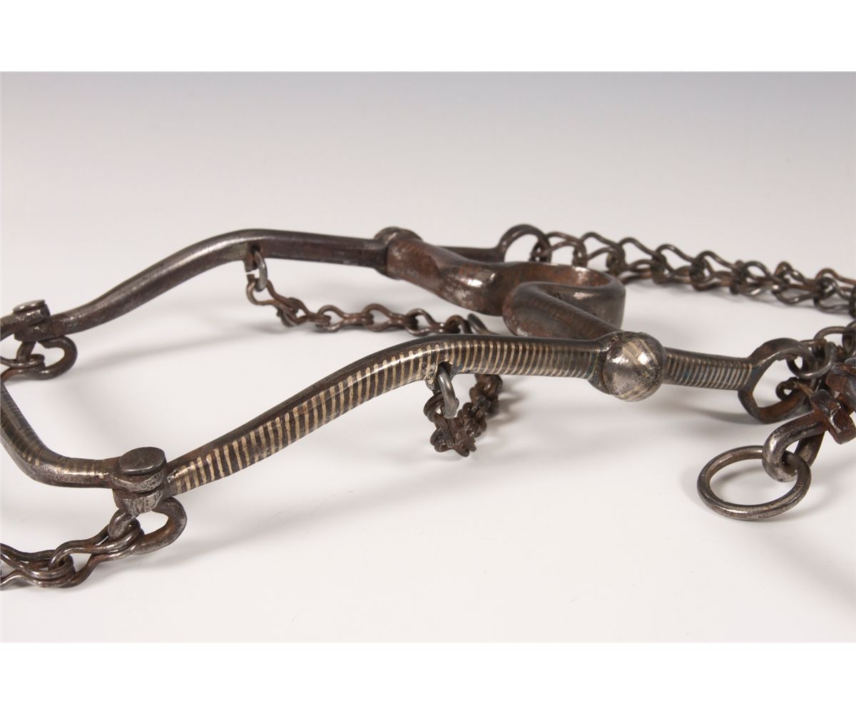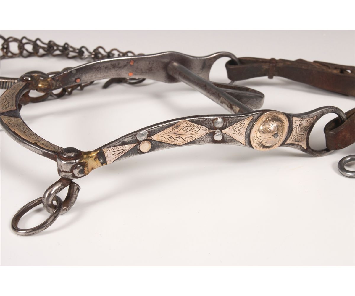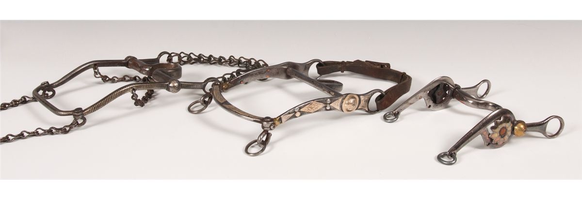 Three Mexican Bits. 1. 9" long with silver and copper inlaid stripes. Rein chains attached. Circa 1920s. 2. 8" long. Silver inlaid and overlaid. Nicely engraved. Circa 1930s.