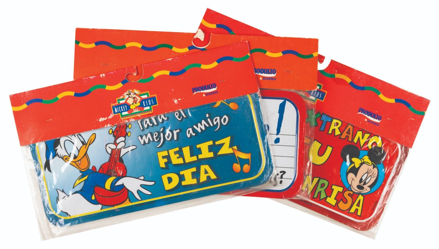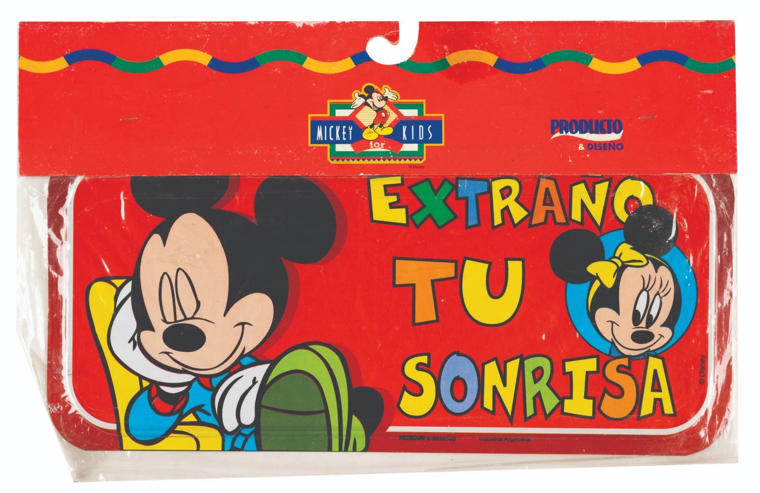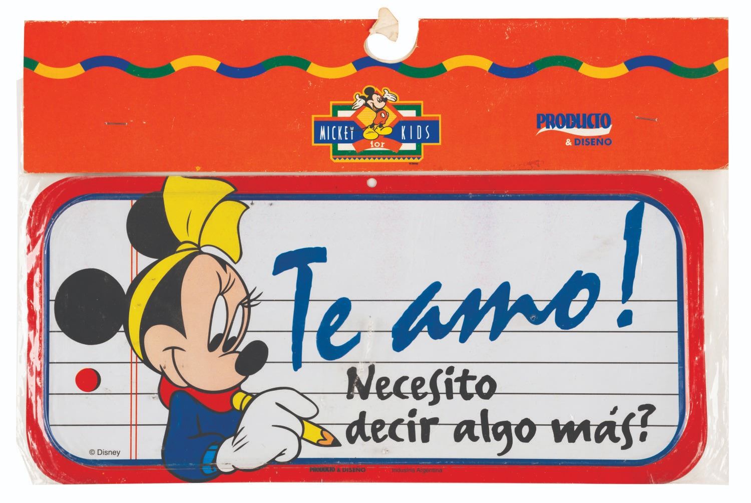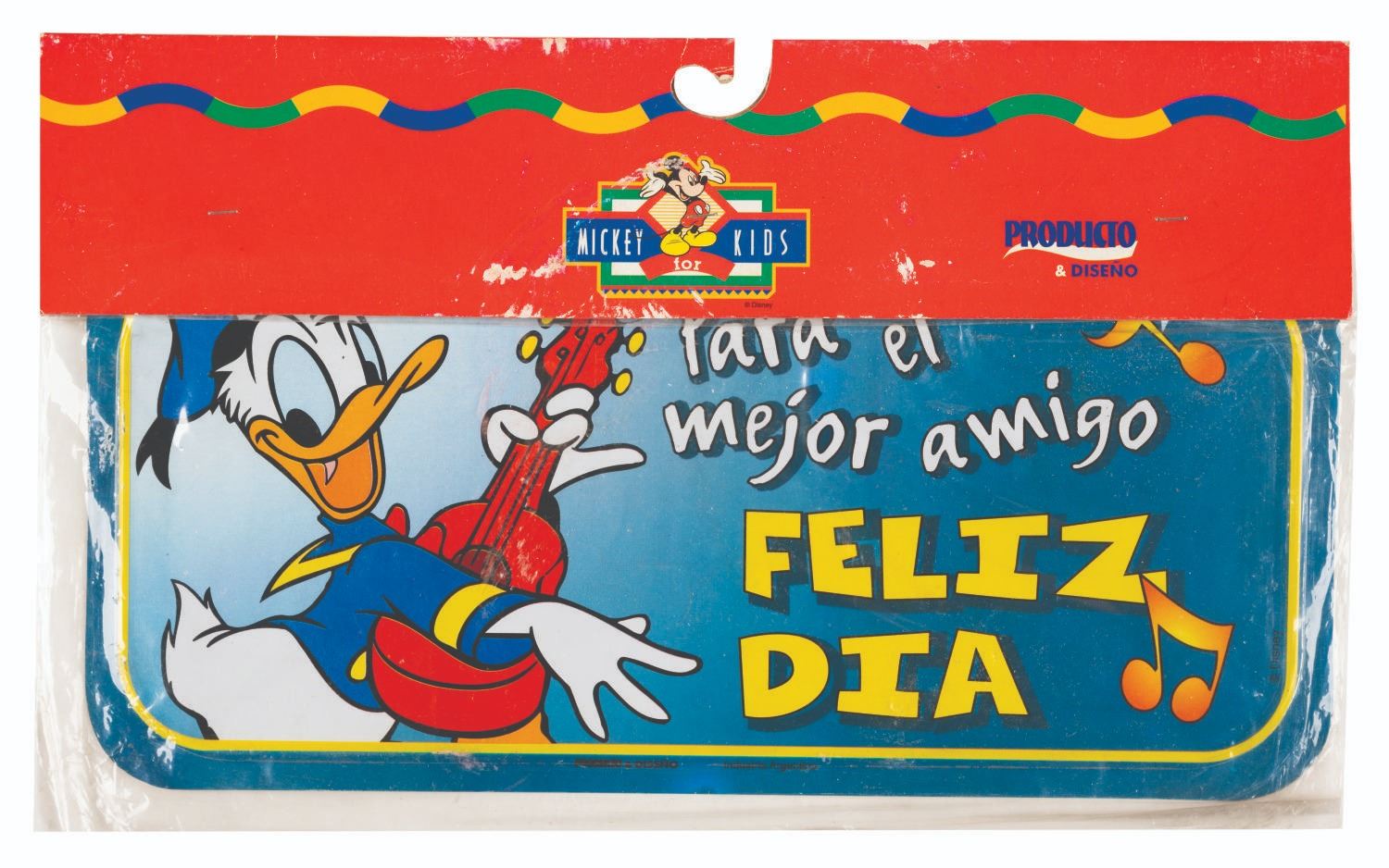 (Disney, 1990s) Three metal license plate-shaped signs with Mickey and friends featuring friendly expressions in Spanish. Measuring 5.25" x 11.25", the signs are in good condition in their original packaging with scuffing, scratches, and creased edges to the packaging.