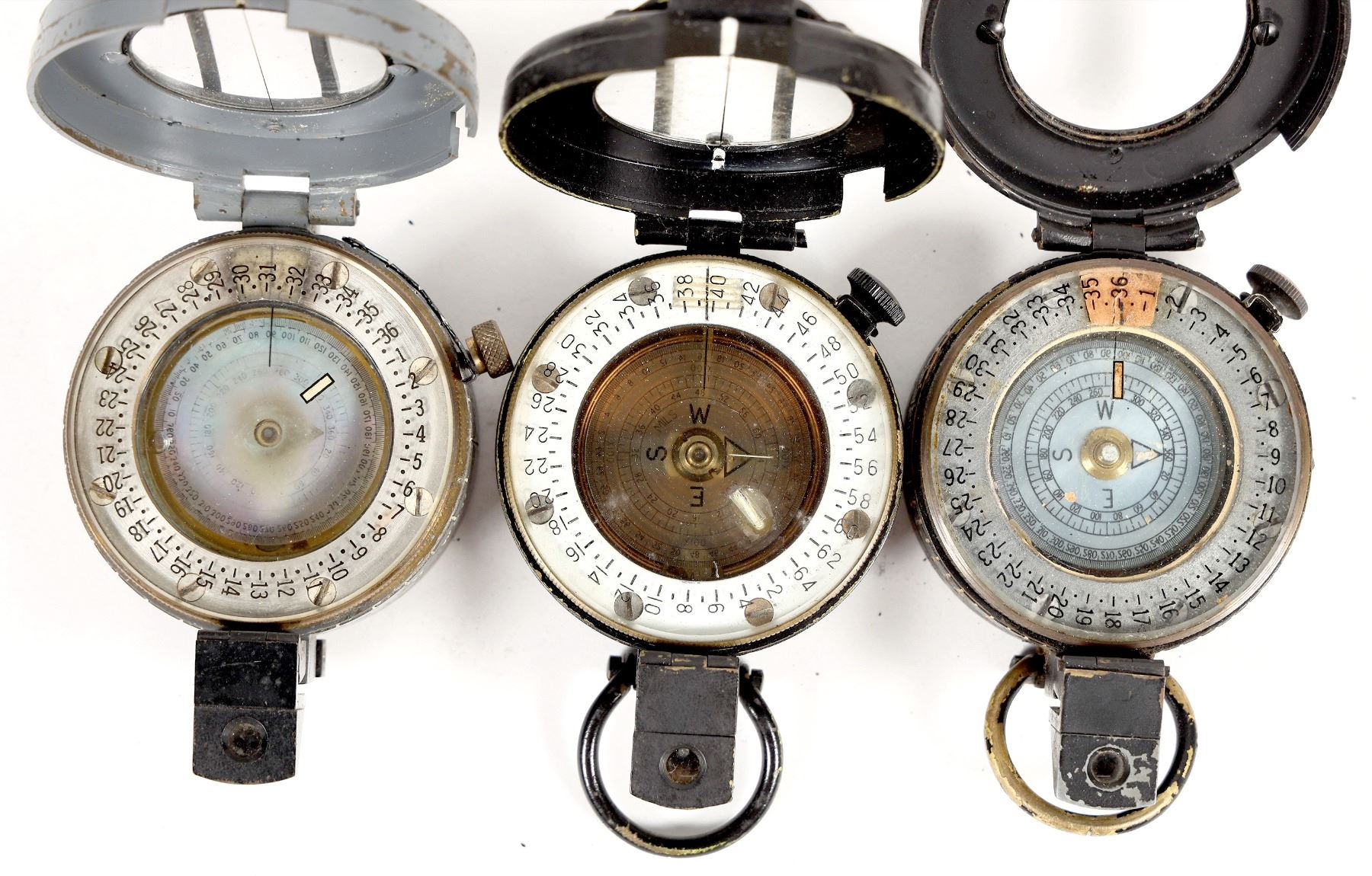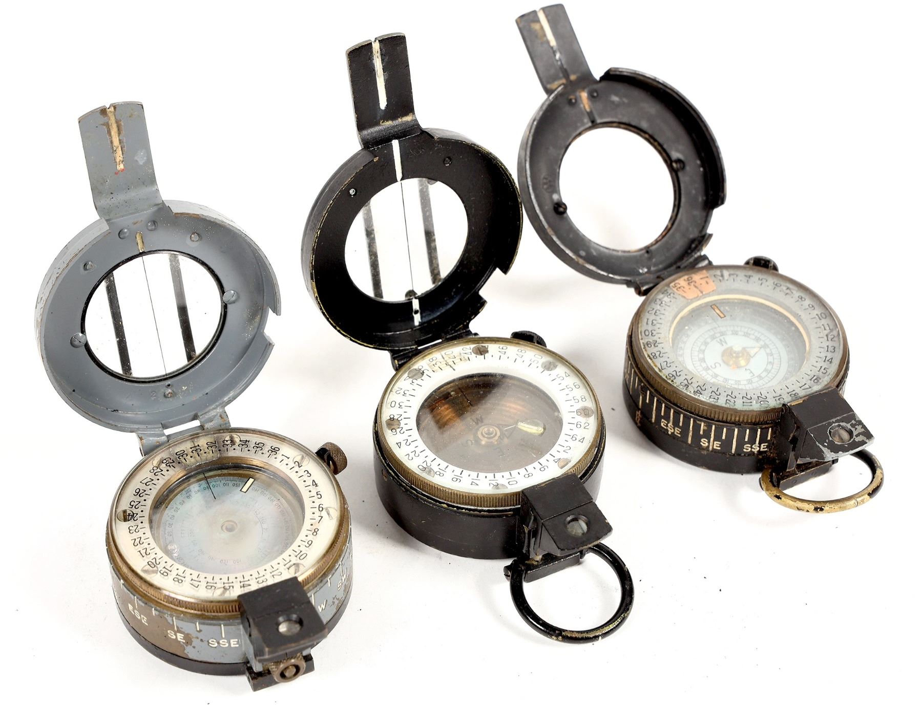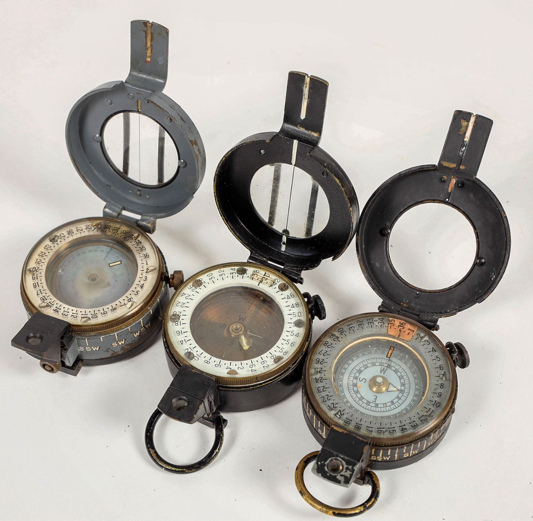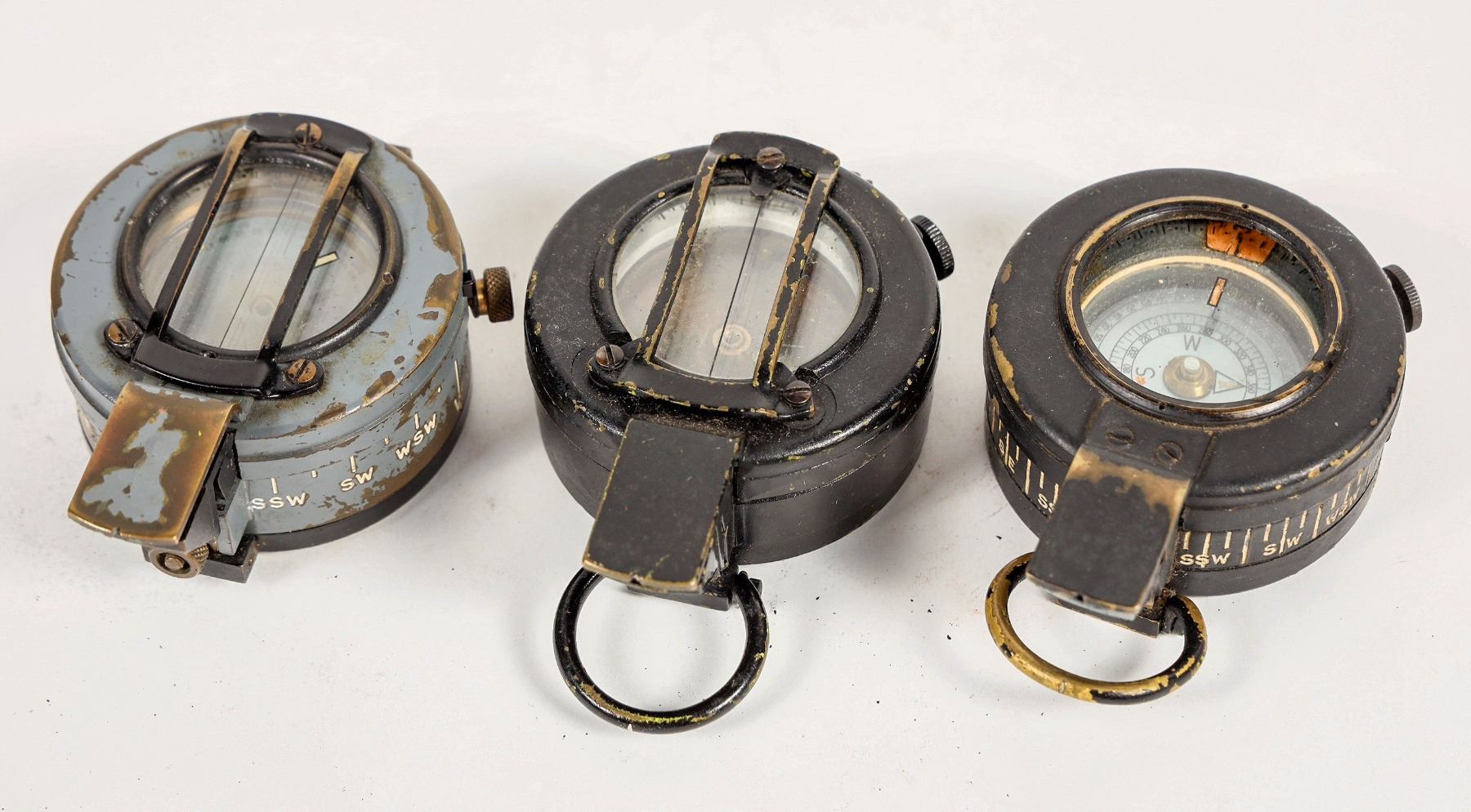 This lot has three WW2 military compasses from the UK. There is a Glauser mk4, a Stanley, and a G.E.C. They work with cloudy lens. From the Popovich collection. Please see photo for details.