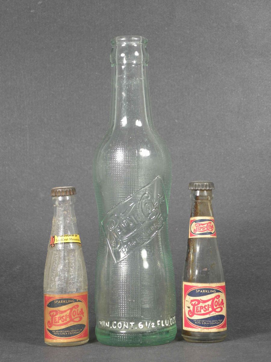 Lot of Three Pepsi-Cola Bottles, two miniature with paper labels souvenir of Look out Mountain and a Double Dot Advertising Novelty and early May West bottle. Very good to good condition.