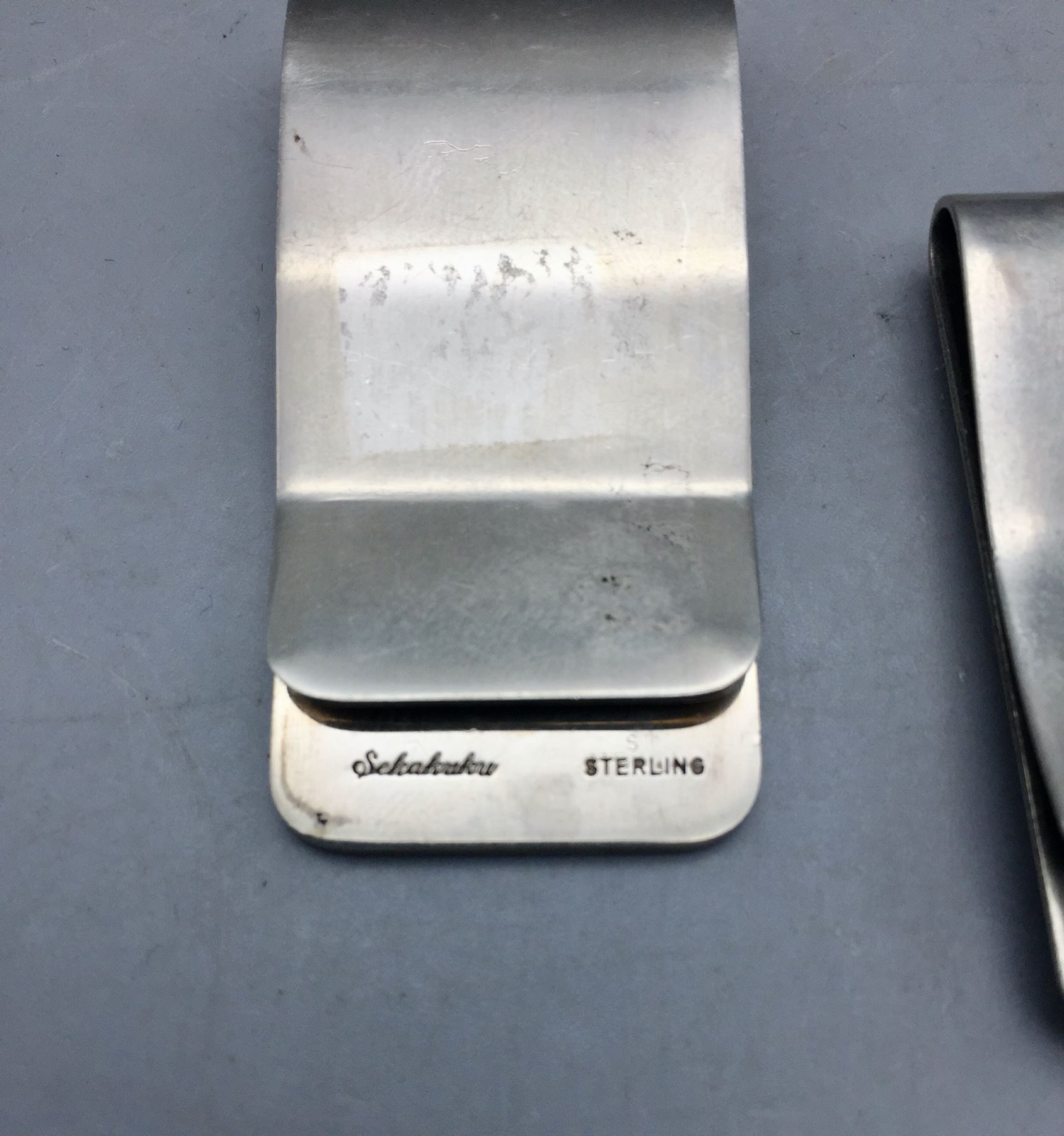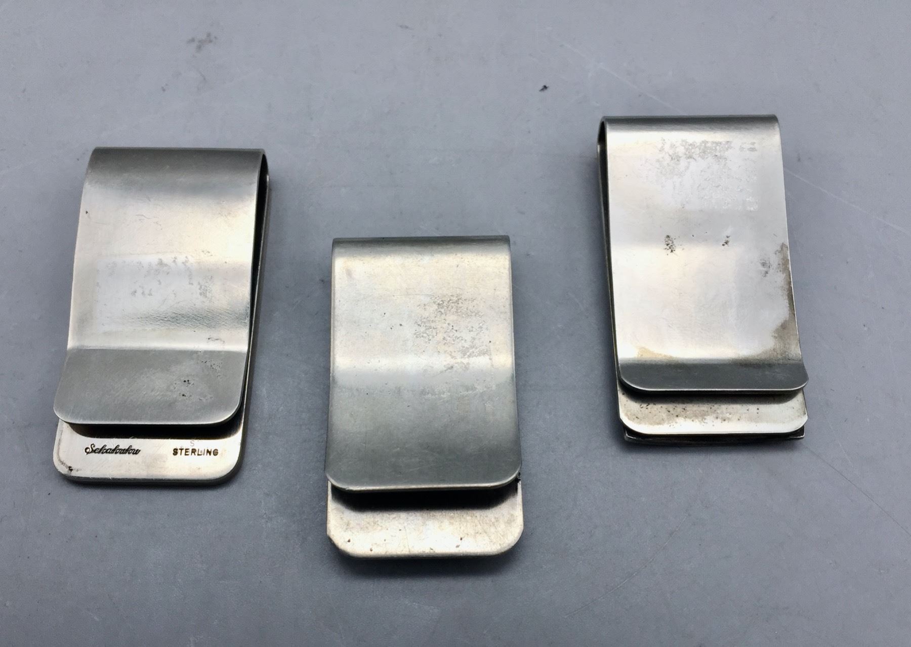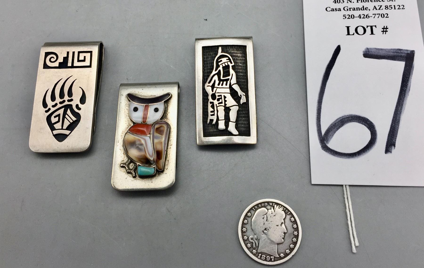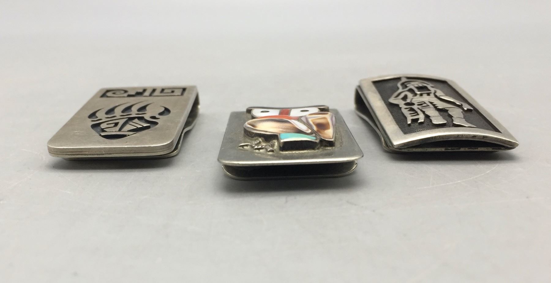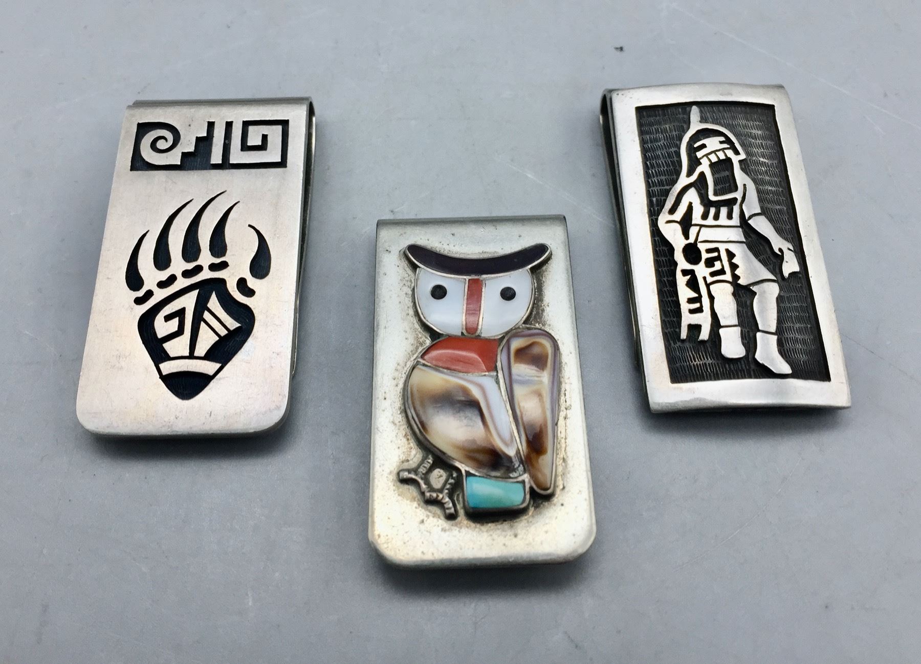 Description: For sale in this lot are three money clips. There is one Hopi, one Navajo and one Zuni. Maker: Various. Approx. Age: The Zuni inlay one is vintage, the other two are more modern. Size: Various. Combined weight id 81.7 grams. Condition: Good for their ages, normal wear expected. Please look closely at the pictures - they are an important part of our description. Shipping: There will be a $5 handling, packaging fee for shipping this lot. The actual cost of postage will be added on top of that.