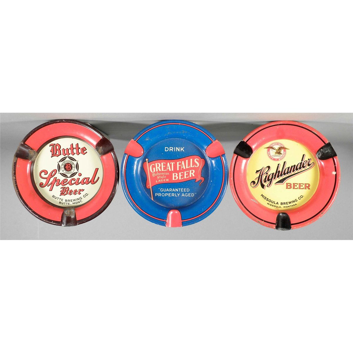 Three Montana Beer Advertising Tin Ashtrays. Great Falls Beer, Butte Special Beer and Highlander Beer from Missoula. Butte has some paint loss at holders and all show slight wear otherwise very good condition. 4 1/2 inch diameter each, Great Falls has glass insert.