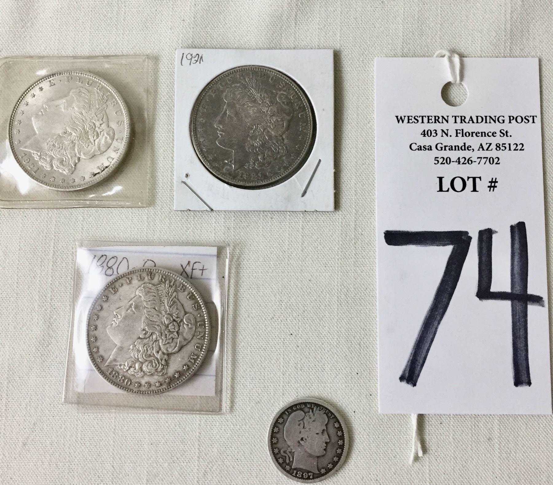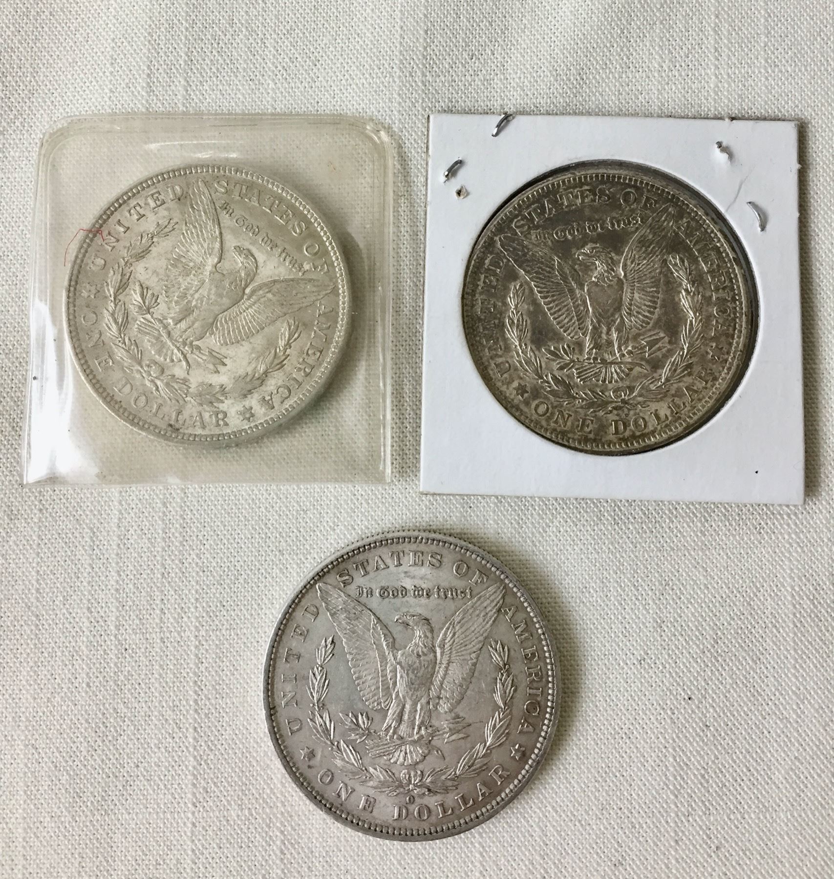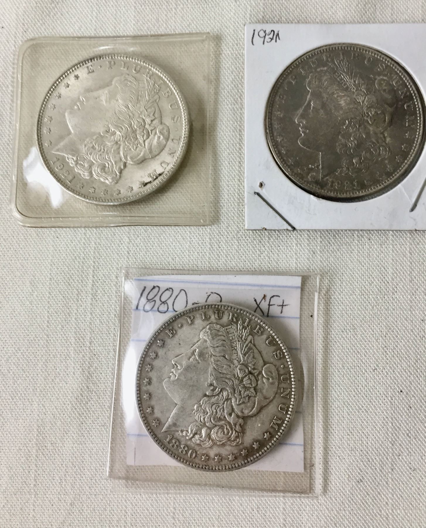 Description: Presented for sale in this lot are three Morgan silver dollars. Maker: US Mints. Approx. Age: One 1880 in very nice condition and two 1921s. Size: Standard silver dollar size. Condition: Circulated, some wear expected and the 1880, although not graded, appears to be very nice. Please look closely at the pictures - they are an important part of our description. Shipping: There will be a $5 handling, packaging fee for shipping this lot. The actual cost of postage will be added on top of that.