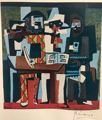 Pablo Picasso Lithograph "Three Musicians" this piece features a Harlequin, a Pierrot, and a monk, who are generally believed to represent Picasso, Guillaume Apollinaire, and Max Jacob, respectively. Apollinaire and Jacob, both poets, had been close friends of Picasso during the 1910s, Pablo Picasso was a Spanish painter, sculptor, printmaker, ceramicist, stage designer, poet and playwright who spent most of his adult life in France.