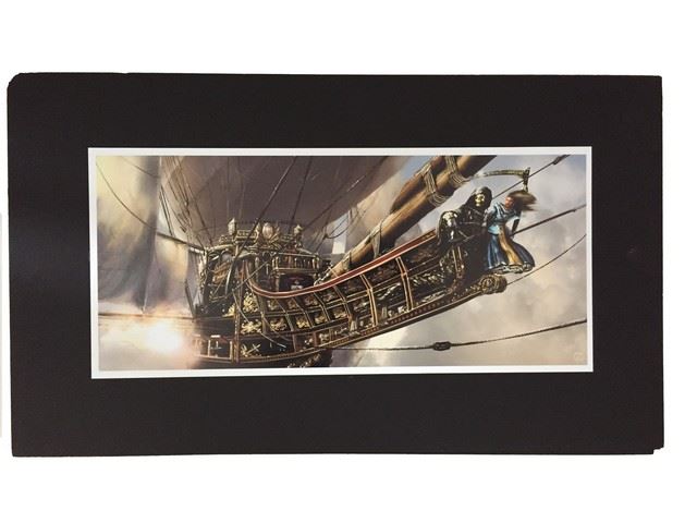 3 Musketeers Airship concept art. Features six artist renderings of the airship on posterboard (26"x15" (posterboard, photo: 20"x9").