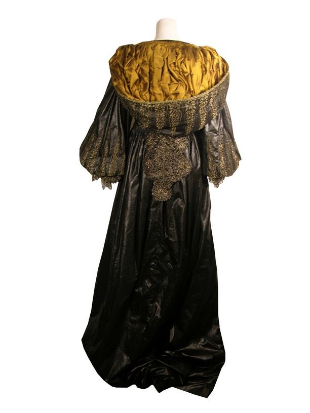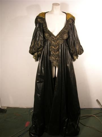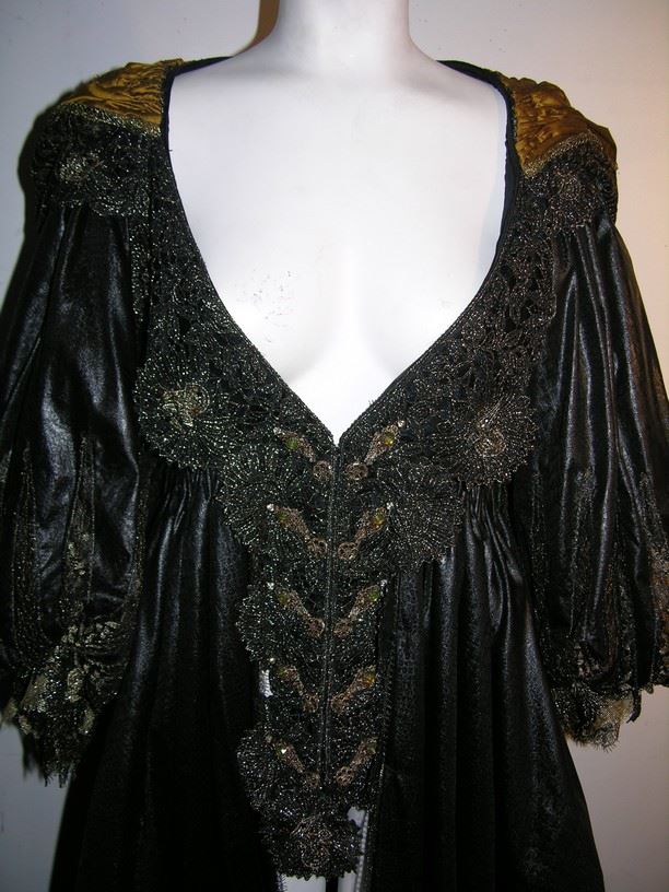 Three Musketeers (2011) - Milady De Winter (Milla Jovovich) Hero, screen worn, ornate black with gold trim on bodice and sleeves and jewels below cleavage, long dress, dark gold ruffled at the chest lace up the back with snaps long custom made dress, and black with gold lacing gloves. From the Venetian Safehouse.