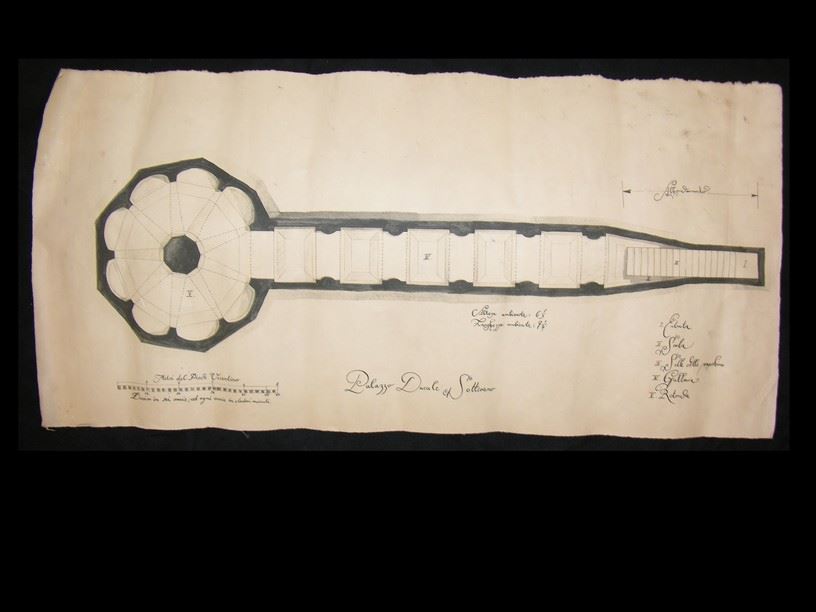 Screen used, Palazzo Ducale Sotterano black and white floor plan on parchment style paper. (approx. 25" x 12")