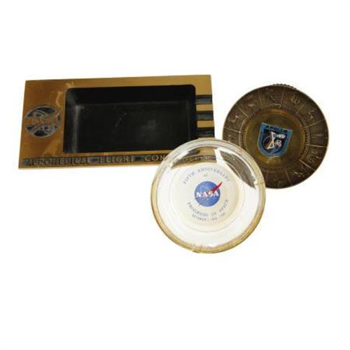 <B>Three NASA Souvenir Ash Trays.</B></I> Includes a round, light brass Apollo 10 ash tray, with a reproduction of the official patch in the bowl of the tray, a heavy brass ash tray stamped "NASA Aeromedical Flight Controller", and a round glass 1963 ash tray commemorating the fifth anniversary of the founding of NASA. All trays are in excellent condition. <I>From the estate of Dr. D. Owen Coons, Chief of NASA's Manned Spacecraft Center Medical Office.</B></I><BR><BR><b>Shipping:</b> Miscellaneous Collectibles, Smal (<a target="_blank" href="http://www.heritageauctions.com/common/shipping.php">view shipping information</a>) <BR><BR><B>Important notice:<