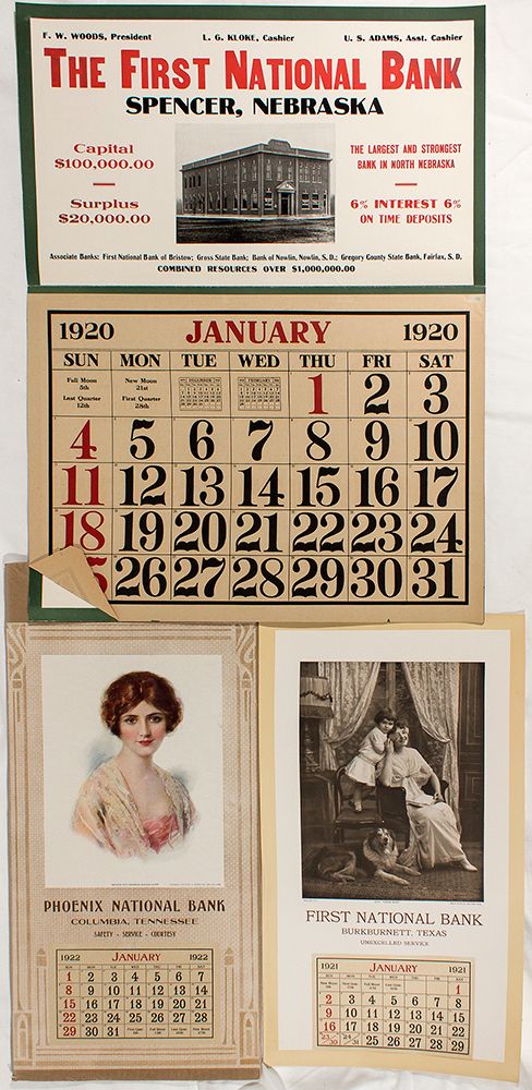 This is a lot that incudes three First Nation Bank calendars. 1). 1921 Burkburnett, Texas measures 24"x 12", 2). Phoenix National Bank, Columbia Tenn. measures 20"x 11" and 3). First national Bank, Spencer, Neb. measures 26"x 20". All are in good condition. - HKA#65979